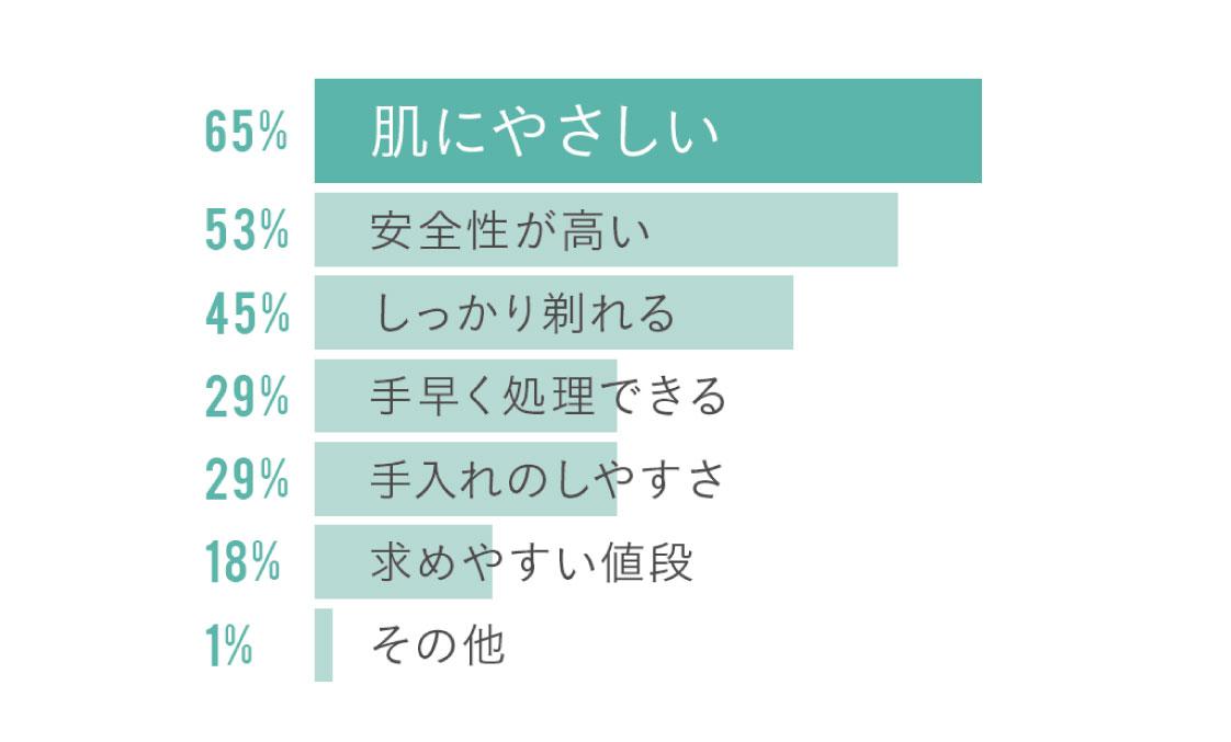 「ただ、ケアしている男性は『清潔感を求めて』など、自分自身に意識が向いているところが、ご自愛を感じられて安心感があります。『ケアアイテムで重視するのは?』で上位に入っている『肌にやさしい』や『安全性が高い』という答えからも、それは感じられます。ただ、これらは懸念でもあるので、それをクリアできて安心して使えるアイテムがあれば、体毛ケアをする男性は、もしかしたらもっと増えるのかもしれませんね」