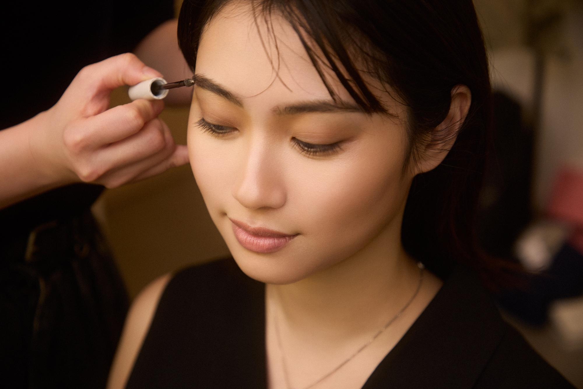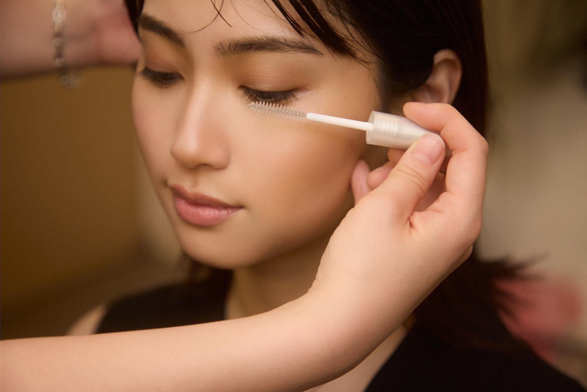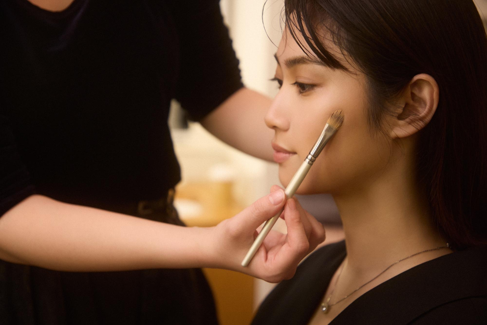 「洗練された大人っぽい女性像を意識しつつ、ピュアな魅力を引き出しました。陰影を重視したミニマルメイクは、内側から溢れるような自然なツヤ感と、骨格を活かした丁寧なシェーディングがポイントです。フルバングはかき上げヘアにチェンジして、デコだしスタイルとLIRIOのウォータリーバームで軽やかな抜け感を」(鈴木さん)