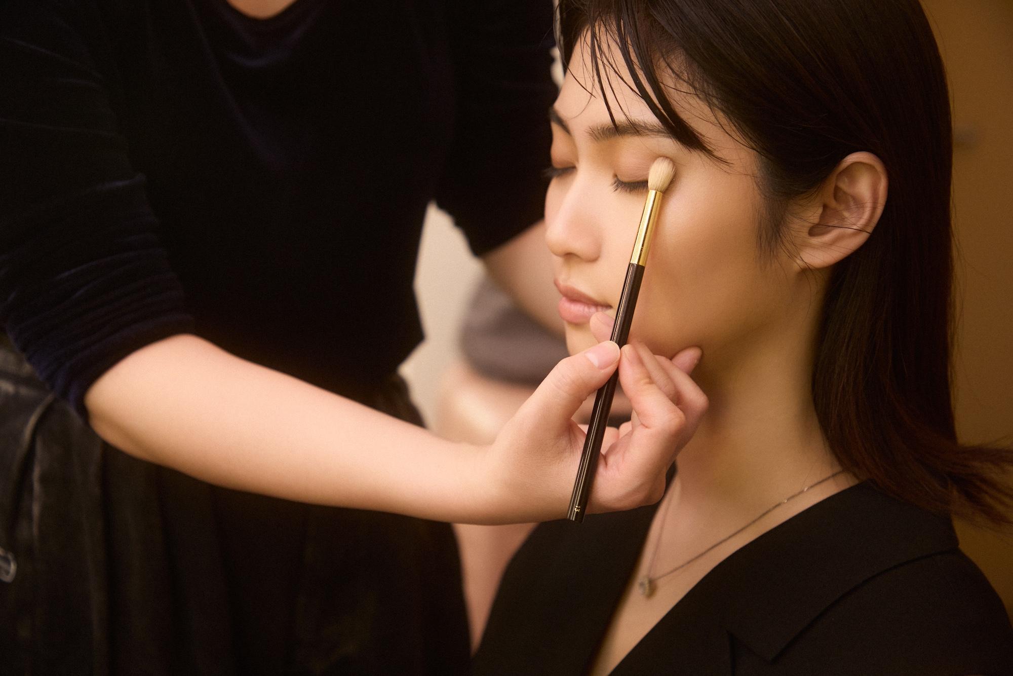 「瞳の強さを活かすため、目の窪みに沿ってこちらも“影”だけ足すイメージ。アイシャドウは控えめに、アイラインもスキップして、まつ毛が映えるカラーレスな目元に」(鈴木さん)