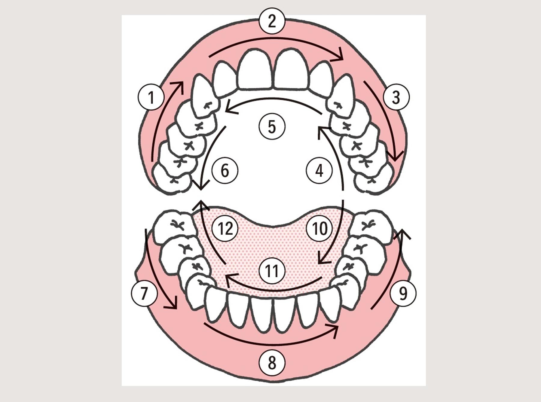 磨き残しなくきちんと歯磨きを終えるには、磨く順番を決めて習慣化することが重要。例えば、磨きにくい上の奥歯から始めて、前歯、反対の奥歯、裏側、下の歯も同様に一筆書きで一周するなどがわかりやすいが、自分が磨きやすい順番でOK。