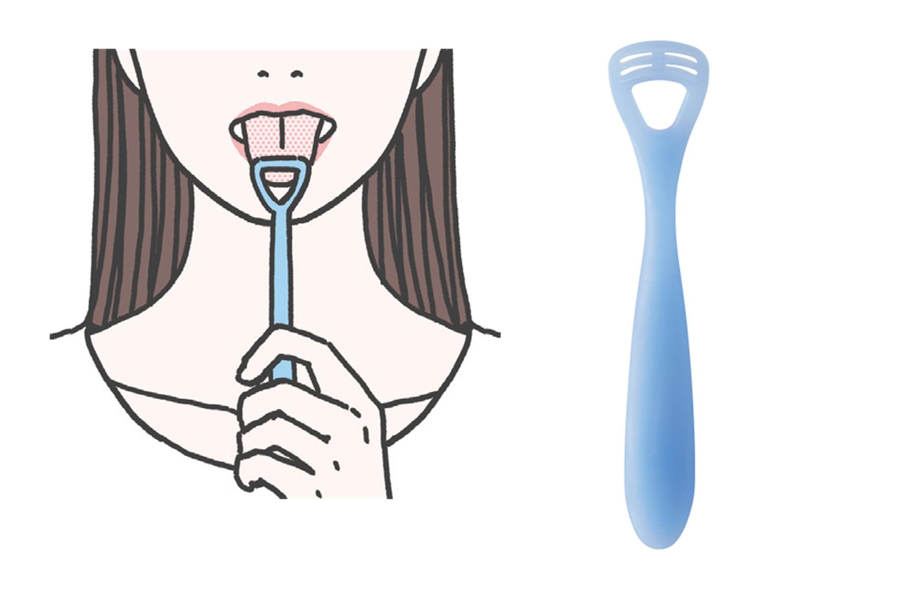 舌の表面に付着している舌苔は、食べかすや細菌が混ざり合ったもの。シリコンなどの舌ブラシを使い、奥から前に向けて10回ほど優しくなぞって取り除いて。「やりすぎると舌を傷めるので、朝だけでOKです」