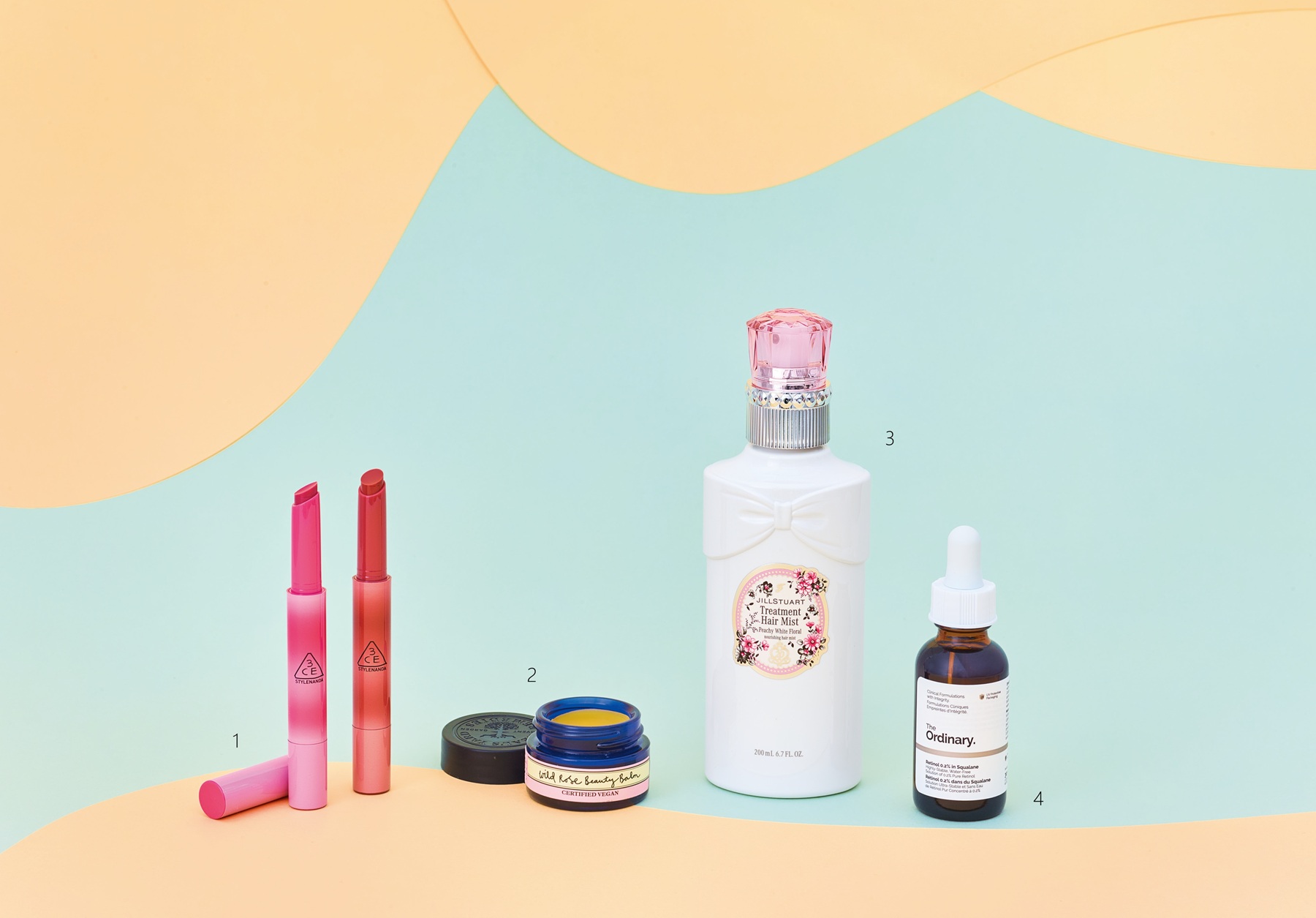 左から ① 3CE「シャインリフレクター」、② NEAL’S YARD REMEDIES「ヴィーガン ワイルドローズ ビューティバーム」、③ JILLSTUART BEAUTY「ピーチーホワイトフローラル トリートメントヘアミスト」、④ The Ordinary「オーディナリー レチノール0.2%インスクワラン」