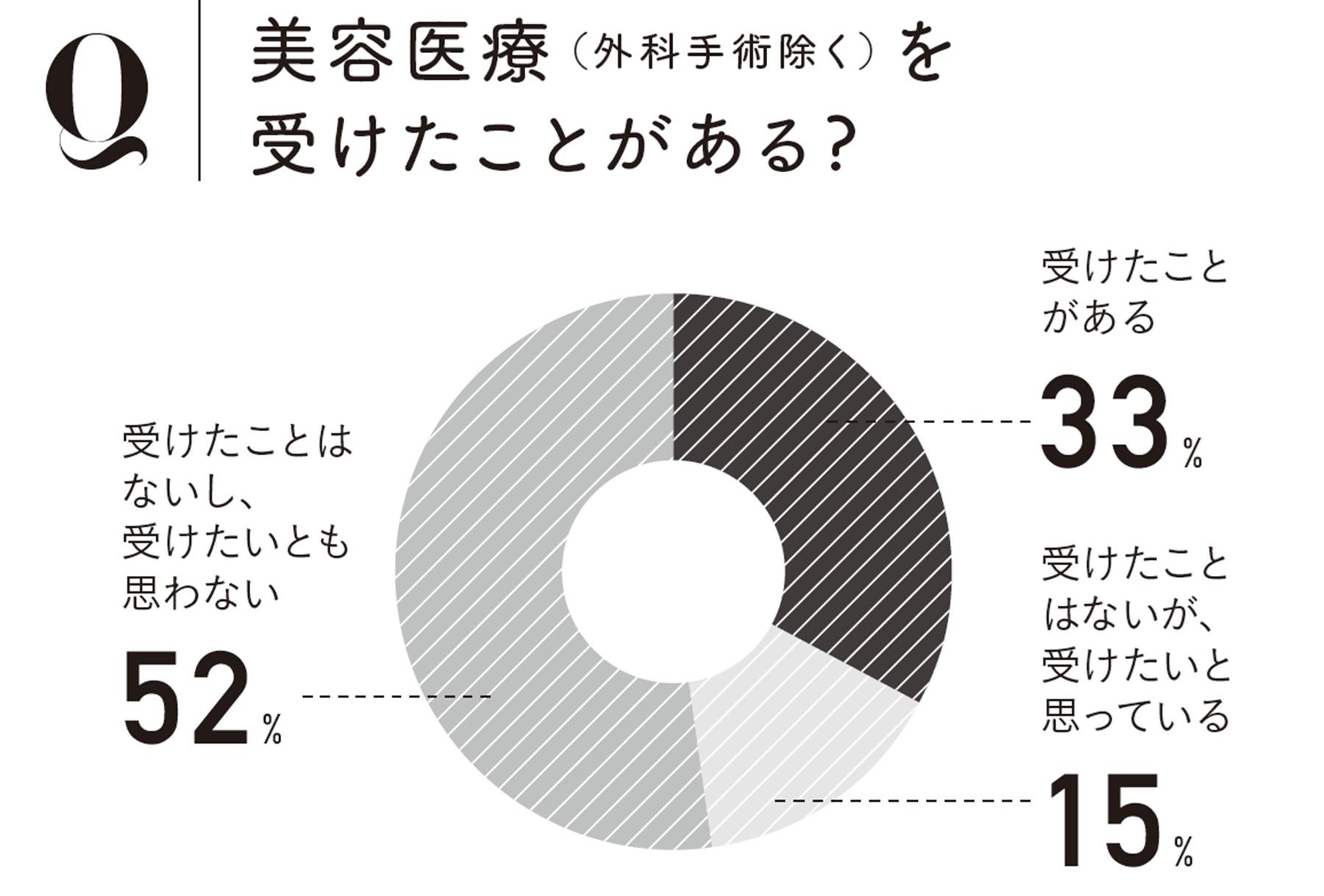 受けたことがある…33%、受けたことはないが、受けたいと思っている…15%、受けたことはないし、受けたいとも思わない…52%/美容医療を経験、今後受けたいと思っている人は約半数に。美容医療はより身近な選択肢となっているよう。