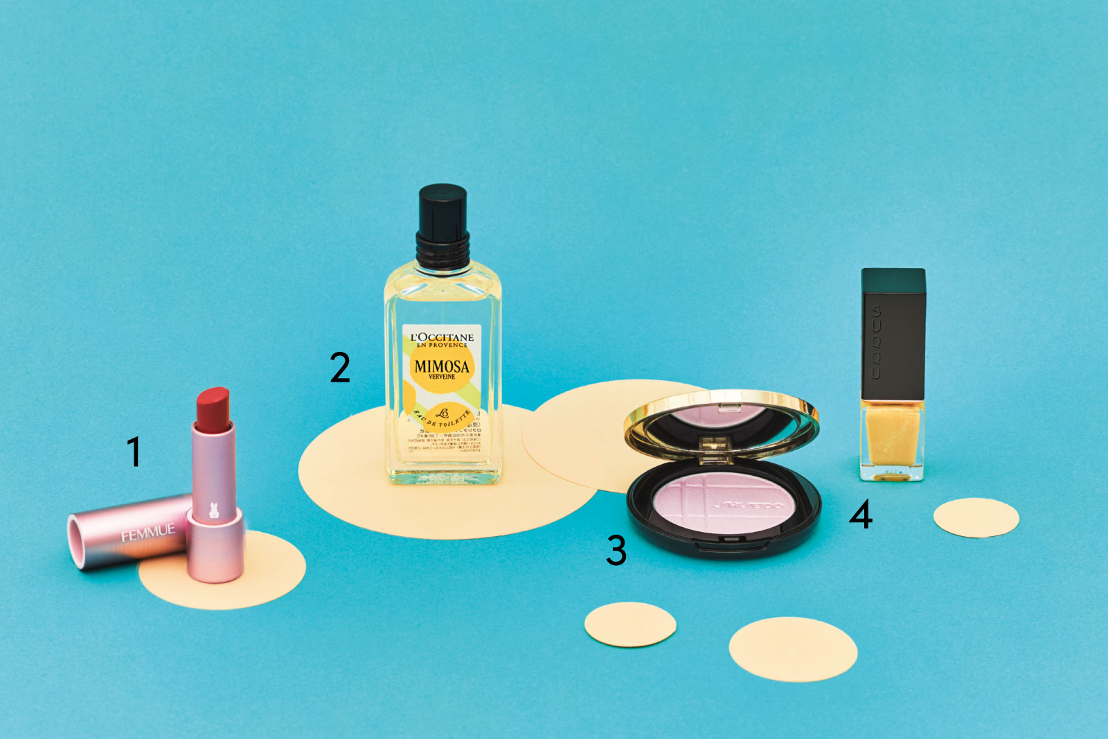 左から、① FEMMUE「ファミュ ル・ルージュ 901」、② L’OCCITANE「ミモザ オードトワレ」、③ SHISEIDO「カラー+グロウ エンハンサー 01」、④ SUQQU「ネイル カラー ポリッシュ」