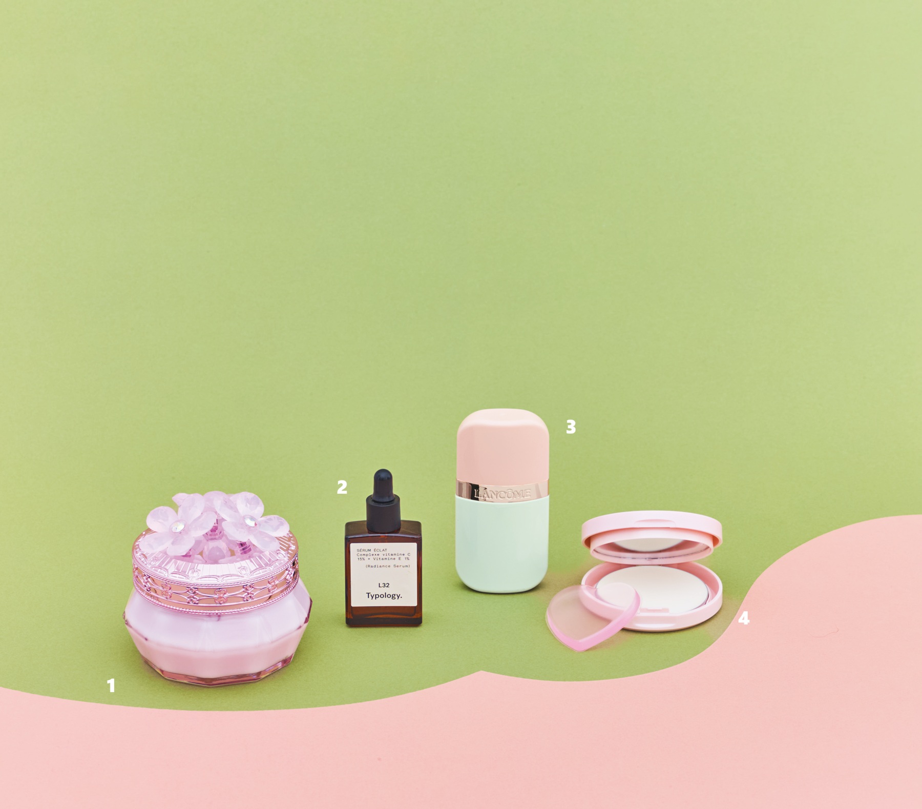 左から、①JILL STUART「ジルスチュアート クリスタルブルーム サクラブーケ パフュームド ボディクリーム」、②Typology Paris「L32 ラディアンスセラム」、③LANCOME「イドル スキンミルク プライマー #03 マッチャ シェイク」、④CLUB cosmetics「クラブ すっぴんUVシールド パクト」