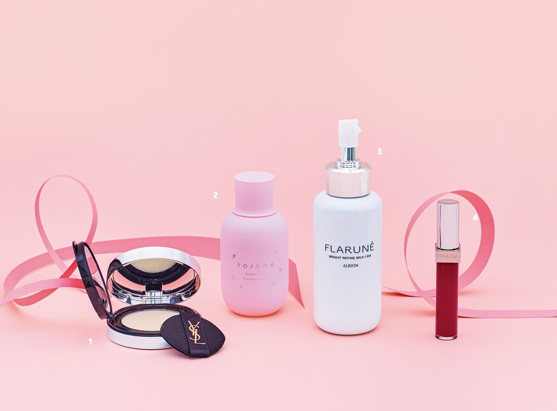 左から、①YVES SAINT LAURENT「オールアワーズ ブラークッション」、②to/one「トーン ドリーム フローラ エッセンス ウォーター SAKURA in Bloom」、③FLARUNE「フラルネ ブライトリファイン ミルク f M/EM」、④PRADA BEAUTY「プラダ リフレクション リキッド バーム グロス」