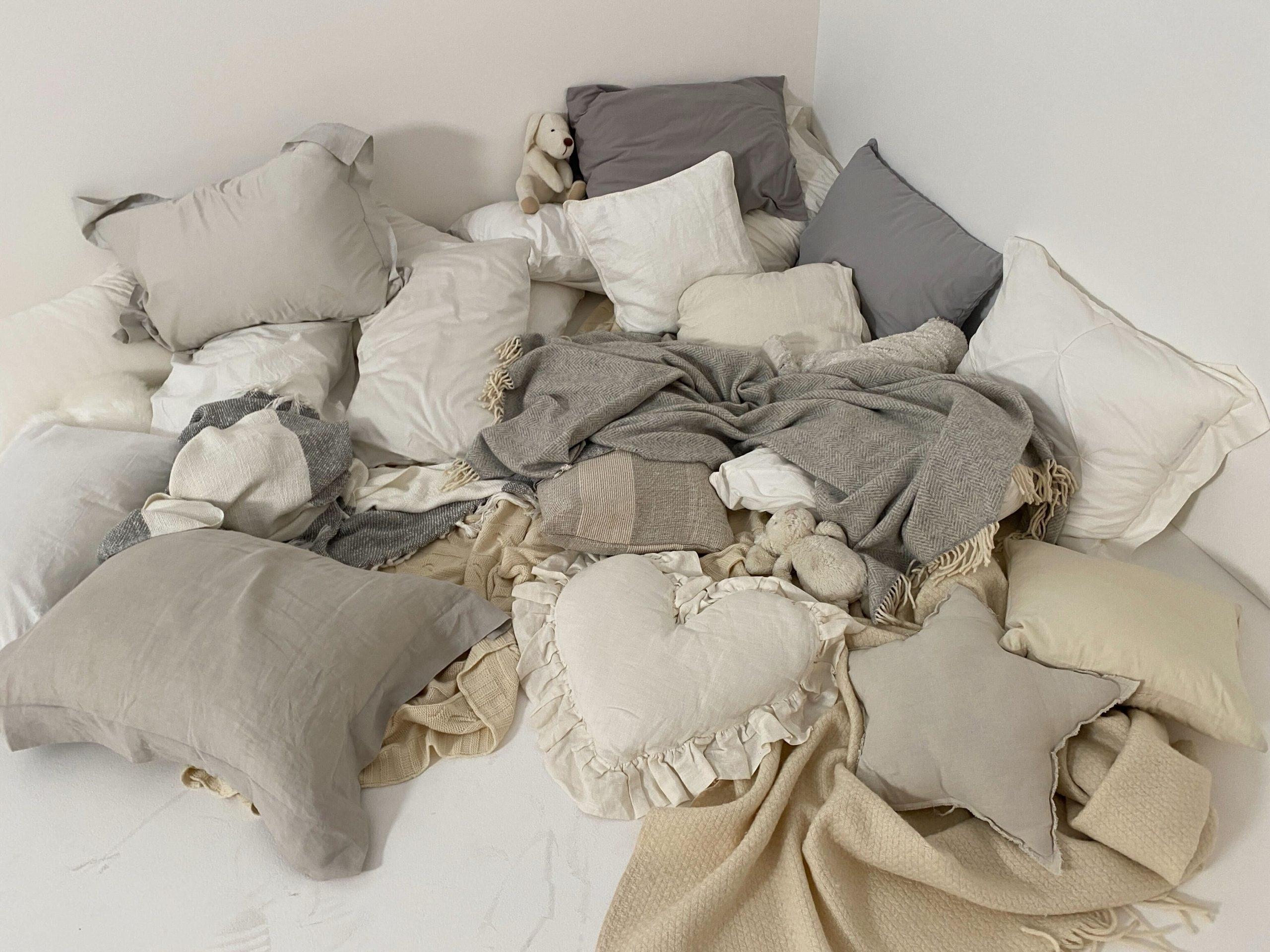 パジャマスタイルでの撮影は大量の枕やぬいぐるみ、ブランケットを小道具に使用。誰がどのアイテムを使ったかは誌面でチェックを。