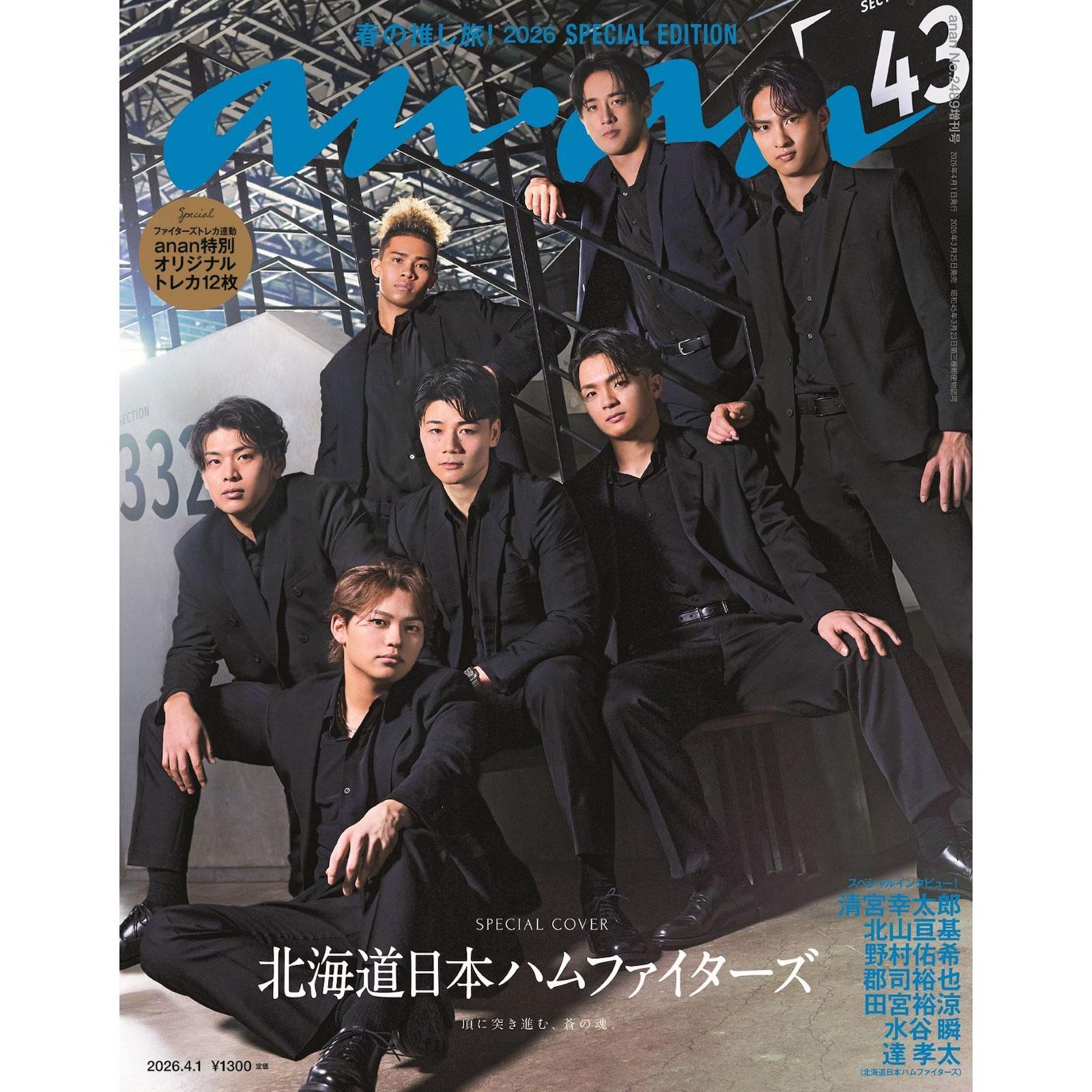 2026年3月25日(水)発売の『anan』(2489号)「春の推し旅!」特集に、北海道日本ハムファイターズから清宮幸太郎選手、北山亘基投手、野村佑希選手、郡司裕也選手、田宮裕涼選手、水谷瞬選手、達孝太投手がスペシャルエディションの表紙とバックカバー、中面グラビアページで登場します。