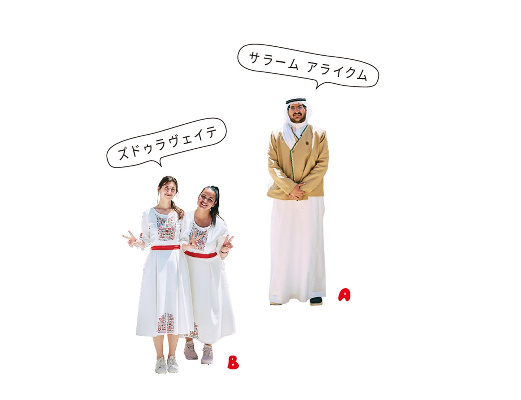 A、世界の国の人々も民族衣装でおもてなし。伝統的なトーブを身につけたサウジアラビア館。