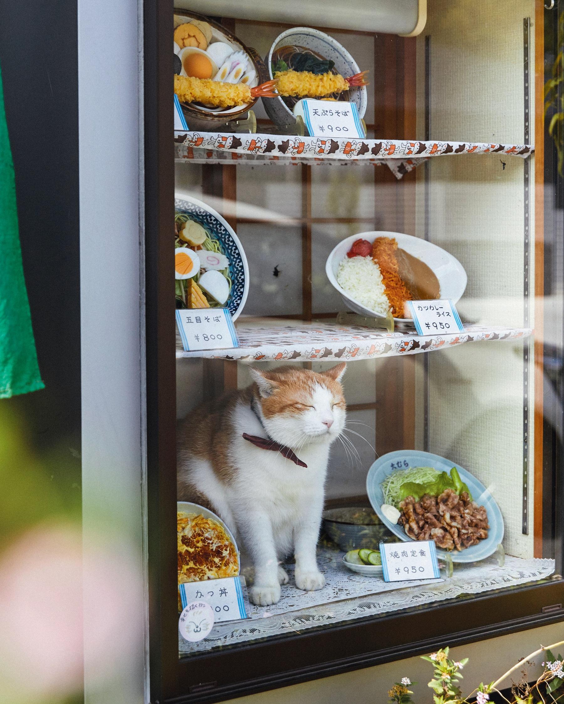 そんな二匹の朝のルーティンが、メニューサンプルを飾った店先のショーケースの中に入って日向ぼっこをすること。招き猫のようにメニューと並ぶ様子が愛らしく、これがSNSで注目を集めるきっかけに。