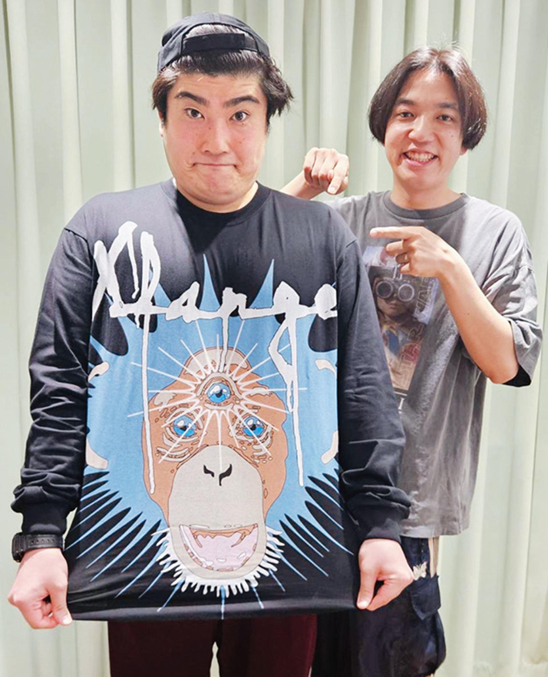 毎年タキノさんに誕生日プレゼントを渡しているという田上さん。「渡す時は、恥ずかしいからなんでもないふうを装って渡してます」(田上)。「今年は何をもらえるのか、楽しみです」(タキノ)。撮影の2日後はタキノさんの30歳の誕生日。二人のレギュラーPodcast番組『例えば炎のあ、エレガンス』(ラジオ関西)#19の収録内で、タキノさんお気に入りブランドのロンTを直接プレゼント(写真は番組提供)。