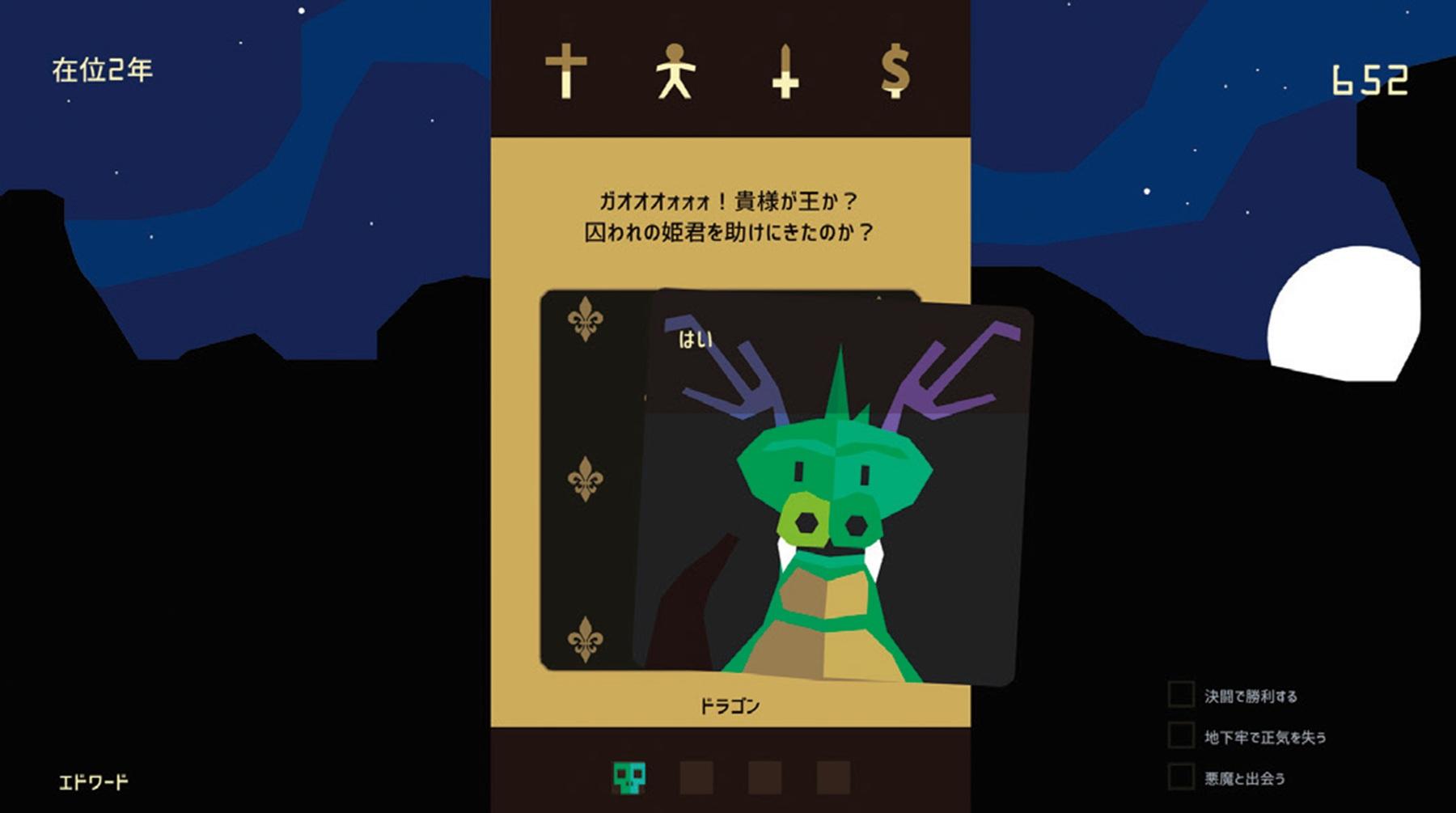 「プレイヤーは中世の君主。家臣や国民から迫られる2択を選び続けると、どんどん国が変化していきます。YES/NOという最小限の入力に対する展開が非常に壮大で、何度も周回プレイしたくなります」。2択をスワイプで選ぶシステムは「Tinder」からインスパイア。マッチングアプリに疲れ、もっとスケールの大きな選択をスワイプしたくなった人にも!?