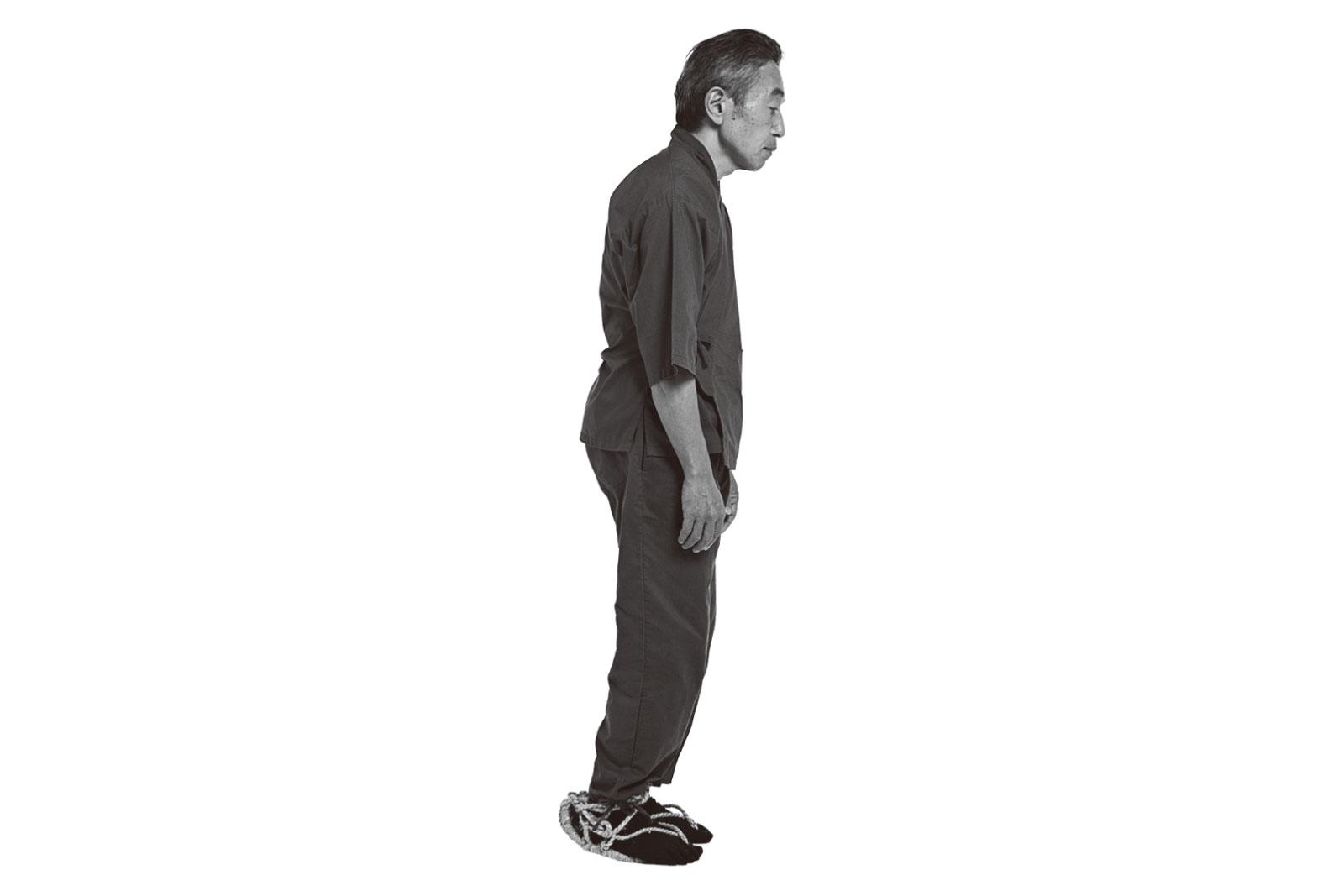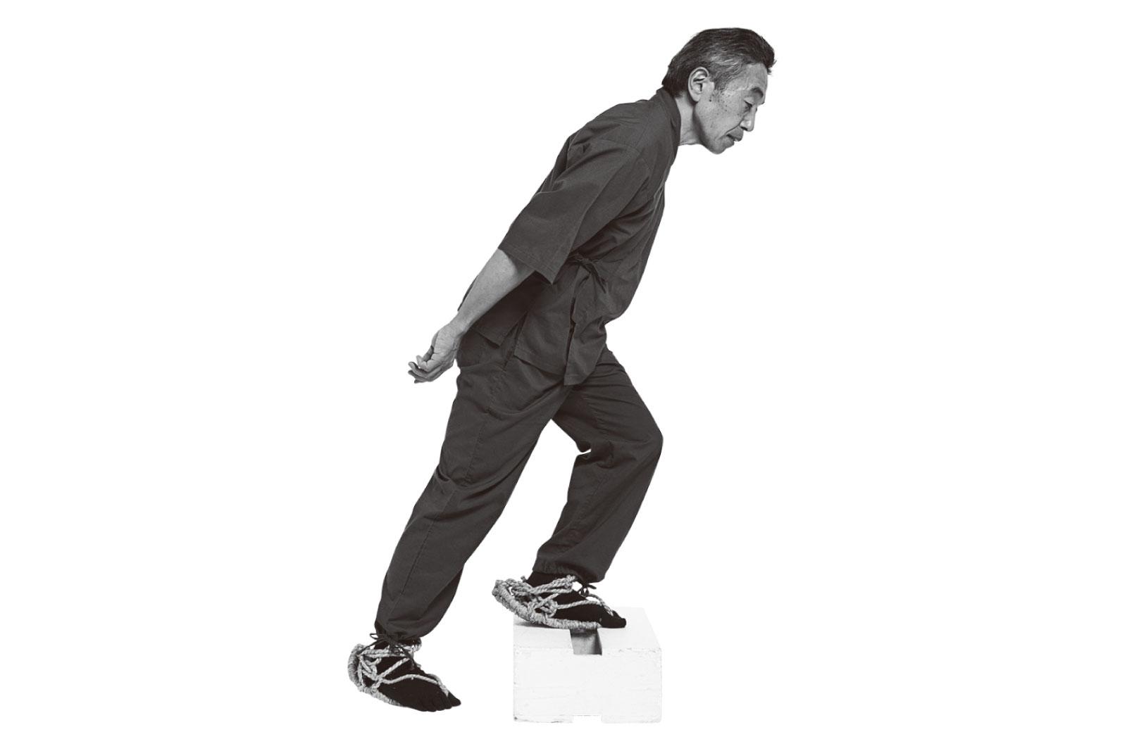 膝を軽く曲げてつま先重心で立つ。/「江戸時代の人たちは、軽く膝を曲げてつま先で立つのが一般的な立ち方でした。これが江戸走りの基本姿勢になります」(大場さん)。まず腰を前に傾けて、前傾姿勢をキープ。膝を軽く曲げて、つま先立ちに。かかとは紙1枚程度浮かせる。※ 足指の付け根の上に膝が乗るように。
