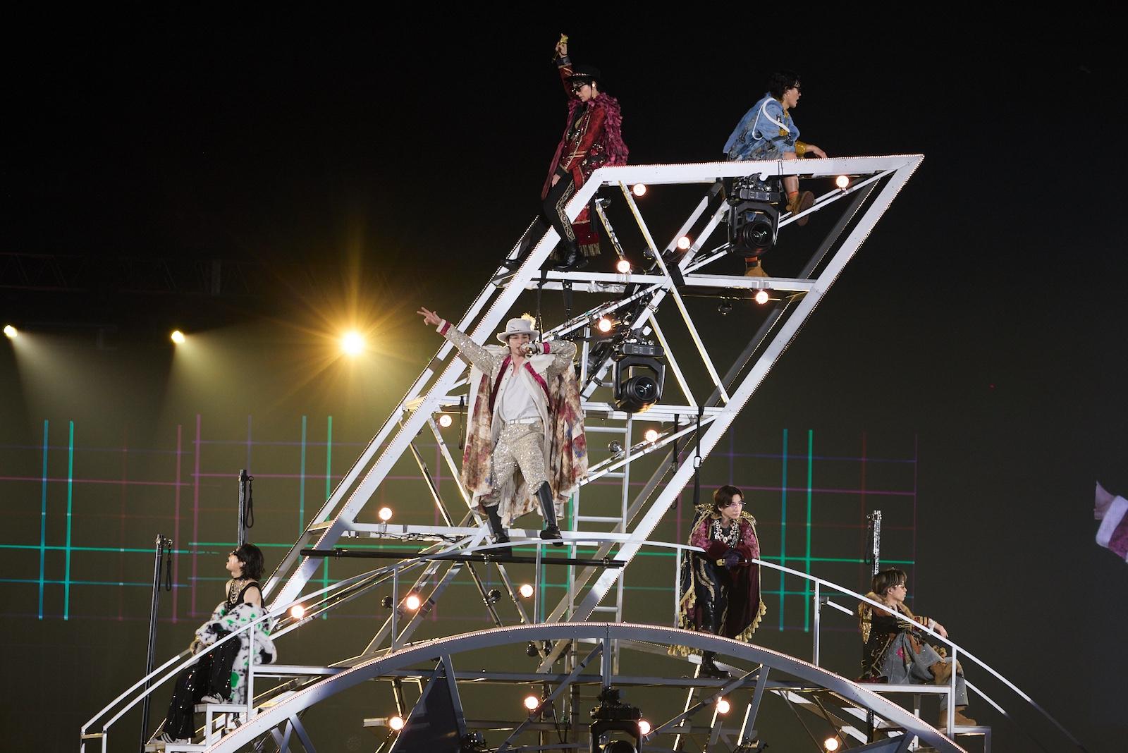 誰もが楽しめるライブ作りにこだわったという今回のステージは、デビュー曲「Imitation Rain」から幕開け。上空8mの⾼さから⽕花を散らしながら、華やかにゴンドラで登場。ゴールド×⿊の⾐裳を⾝に纏い、サングラスやリムレスメガネをかけた6⼈が紅に染まる照明に照らされる姿は、堂々たるオーラに満ち溢れている。