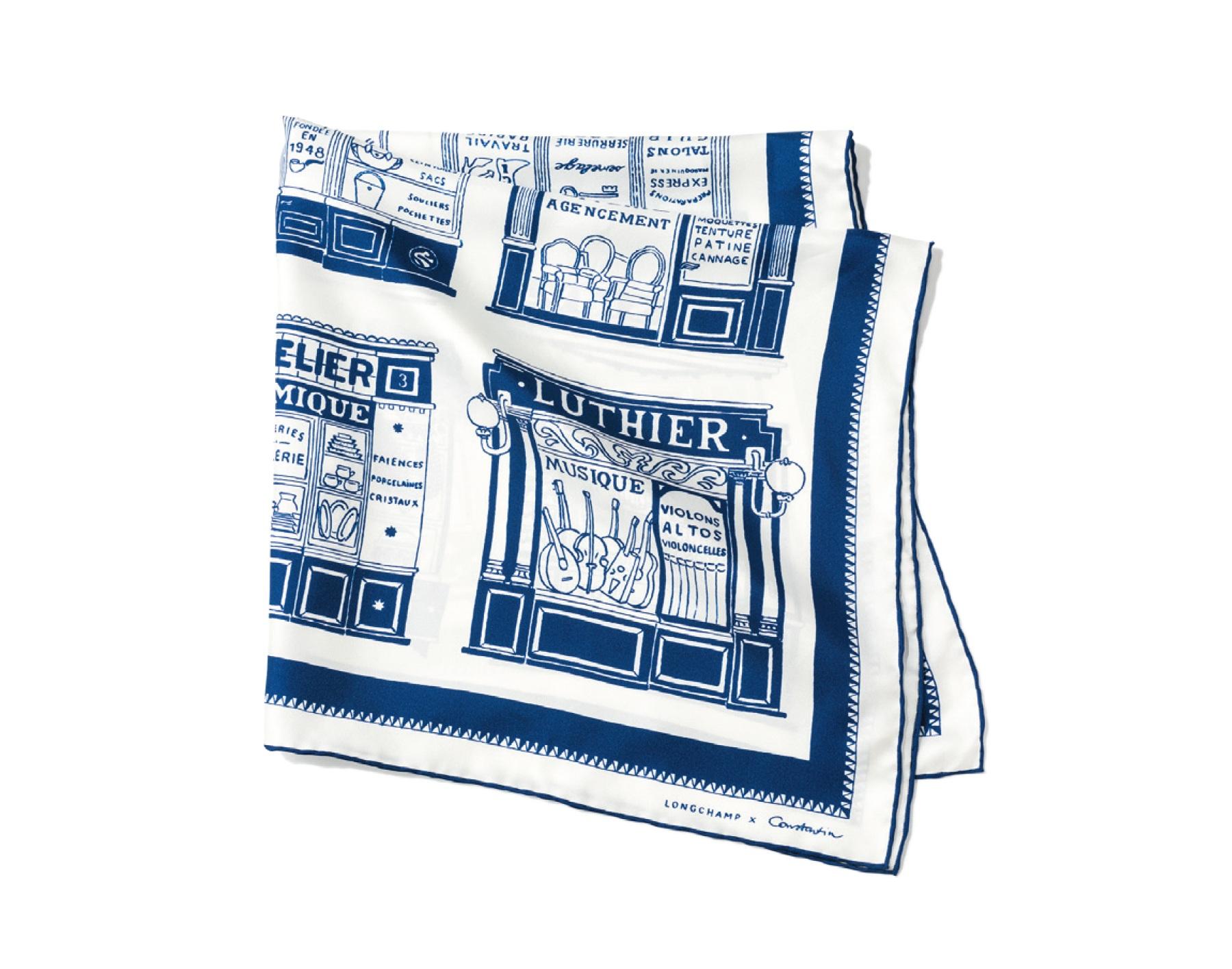 花屋やパン屋など、パリの街を支える職人たちを称えた絵柄のスカーフは、アーティストのコンスタンタン・リアンによるもの。ブルーが印象的。
