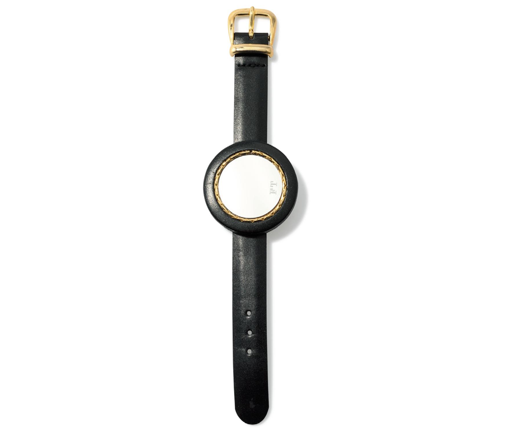 腕時計の文字盤の部分にミラーを配したブレスレットは、レザー×ゴールドバックルの組み合わせでリュクス感も抜群。毎日のちょっとしたメイク直しにも便利。