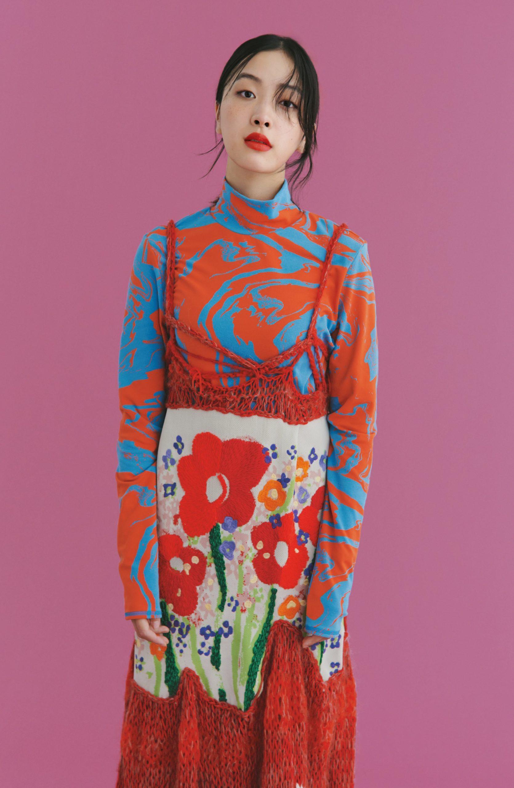 「この秋のファッションはノスタルジック&クラシック回帰という大きなトレンドの流れがある中で、ヴィンテージ風の花柄やフラワーモチーフが注目を集めています」とスタイリストの伊藤信子さん。レトロなフラワーモチーフのパッチワーク刺繍をあしらったニットドレスは、トップスのインパクトあるサイケデリックプリントにも負けない存在感が。「昔懐かしいおしゃれが気になっているという花瀬さんに似合うと思って選びました」(伊藤さん)。「最近、1960年代のファッションスタイルや色合いに惹かれていたので、この花の刺繍にときめきました。柄と柄の組み合わせもすごく新鮮です」(俳優・花瀬琴音さん)