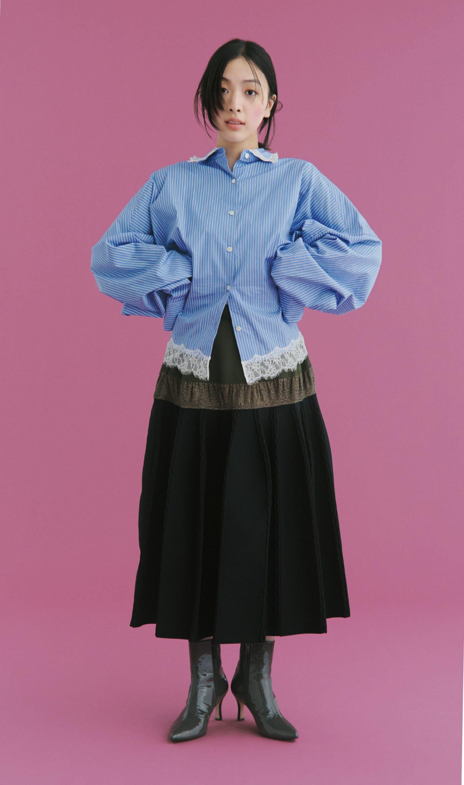 シャツ¥44,000(アキコアオキ TEL. 03-5829-6188) スカート¥63,800(オダカ/エスアンドティ) ブーツ¥39,600(ヨシト/ニューロンドン TEL. 03-5603-6933)