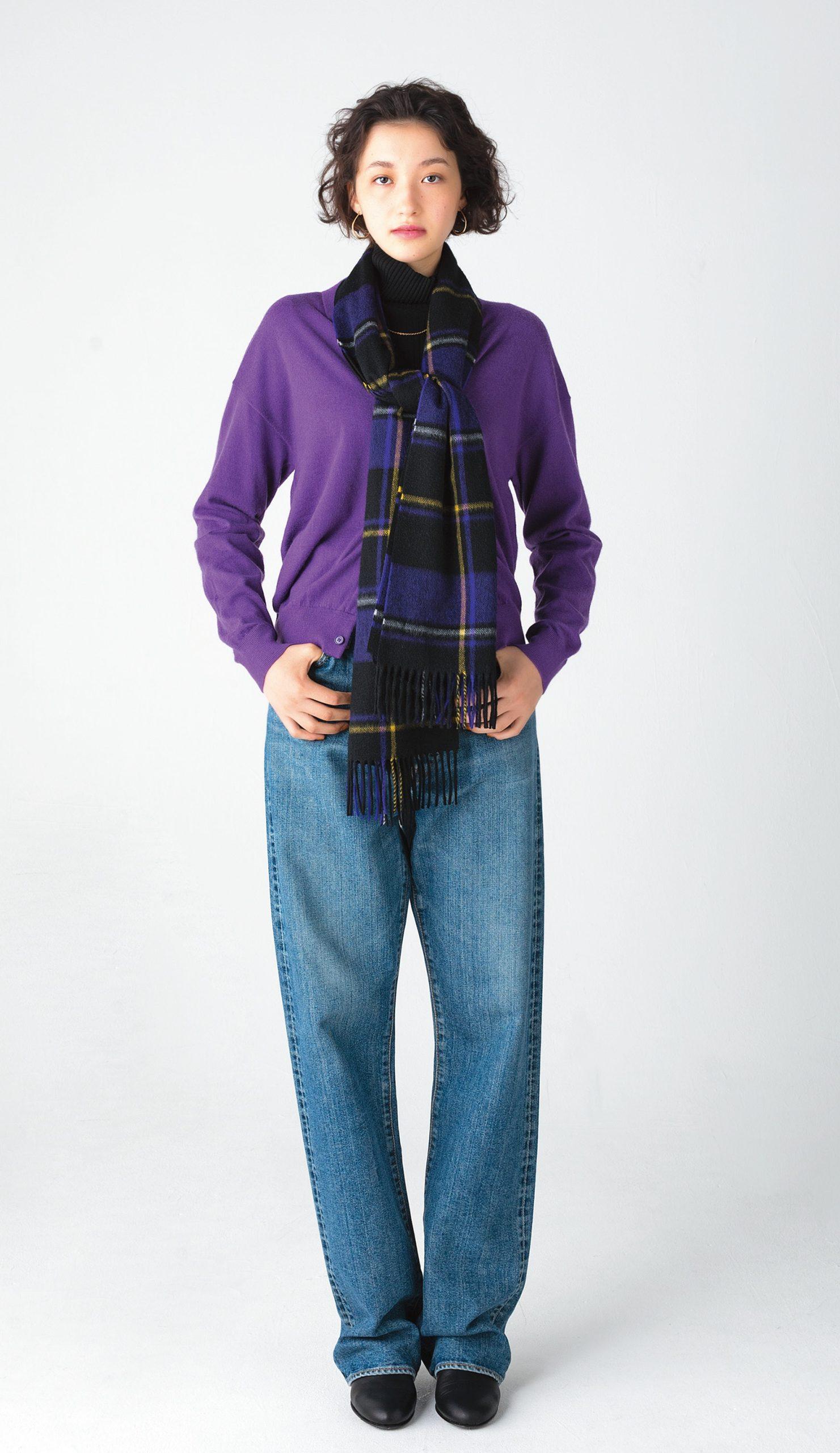 マフラー¥52,800(ジョシュアエリス/真下商事 TEL. 03-6412-7081) ニットポロ¥41,800(キャッシュアンドバルバ/エグジステンス info@cashbarba.com) デニムパンツ¥34,100(ザ シンゾーン/シンゾーンルミネ新宿店 TEL. 03-5909-4088) ブーツ¥52,800(ワイエムウォルツ/マービン&ソンズ TEL. 03-6276-9433) ピアス¥42,900(ボーニー/RHC ロンハーマン TEL. 0120-983-781)