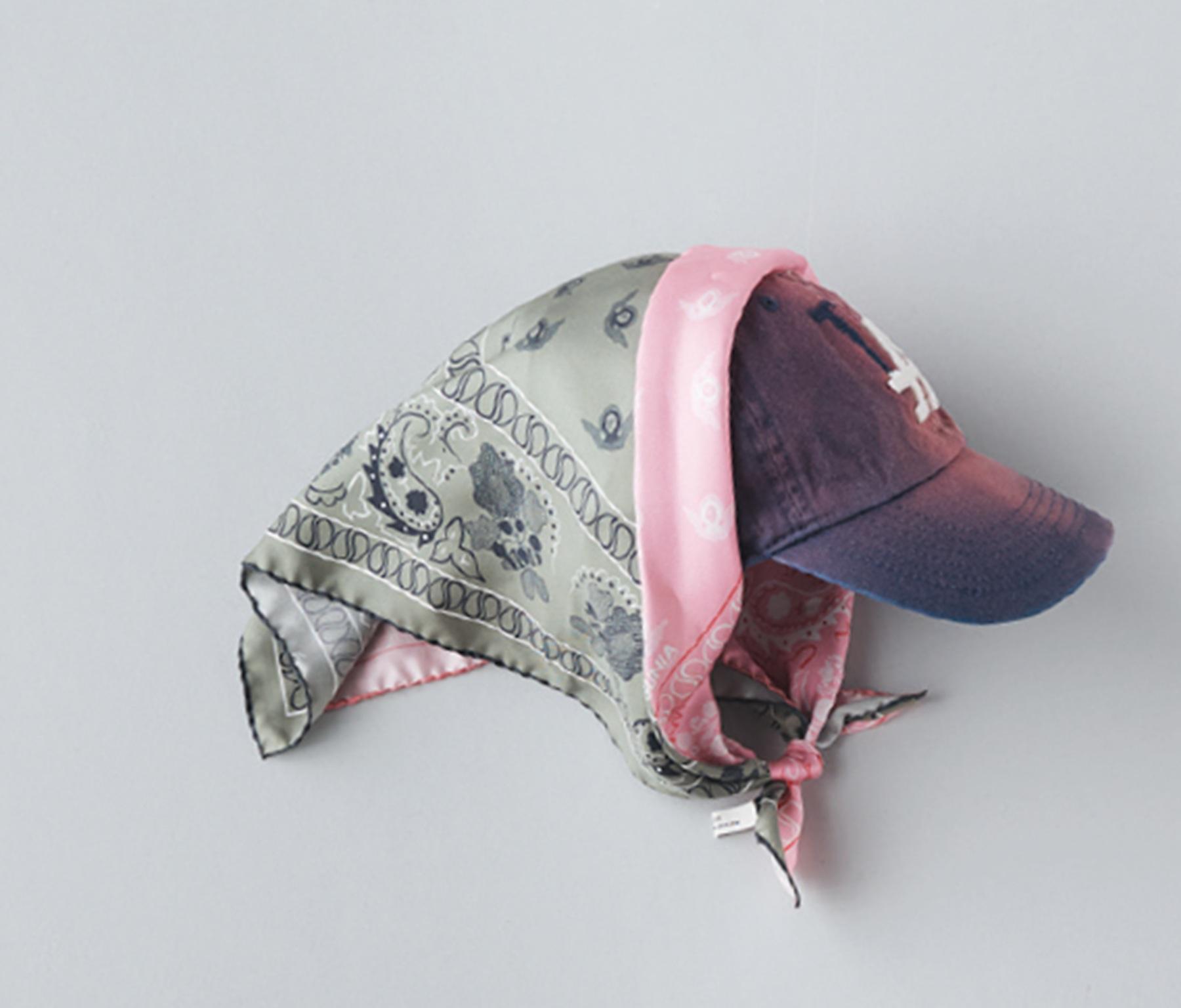 バイカラーバンダナプリントスカーフ55×55cm ¥28,600(グーニャ プロジェクト/H3O ファッションビュロー TEL. 03-6712-6180) キャップ¥8,800(オーセン ジャパン/ラフォエム info@authenjapan.com)