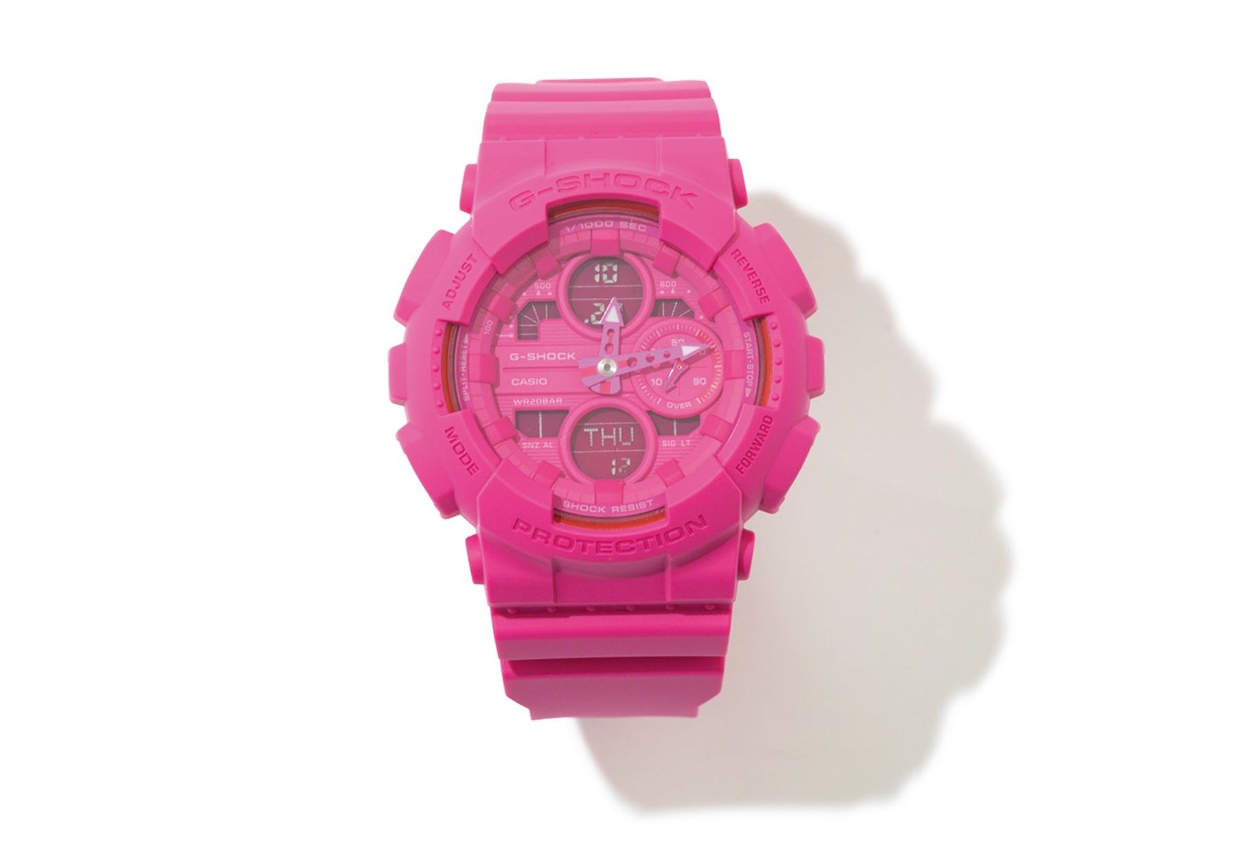 ビビッドピンクのワントーンで仕上げたキュートな腕時計。本モデルの売り上げの5%は日本乳がんピンクリボン運動を支援する団体へ寄付されるそう。¥18,150(G-SHOCK/カシオ計算機 お客様相談室 TEL. 0120-088925)