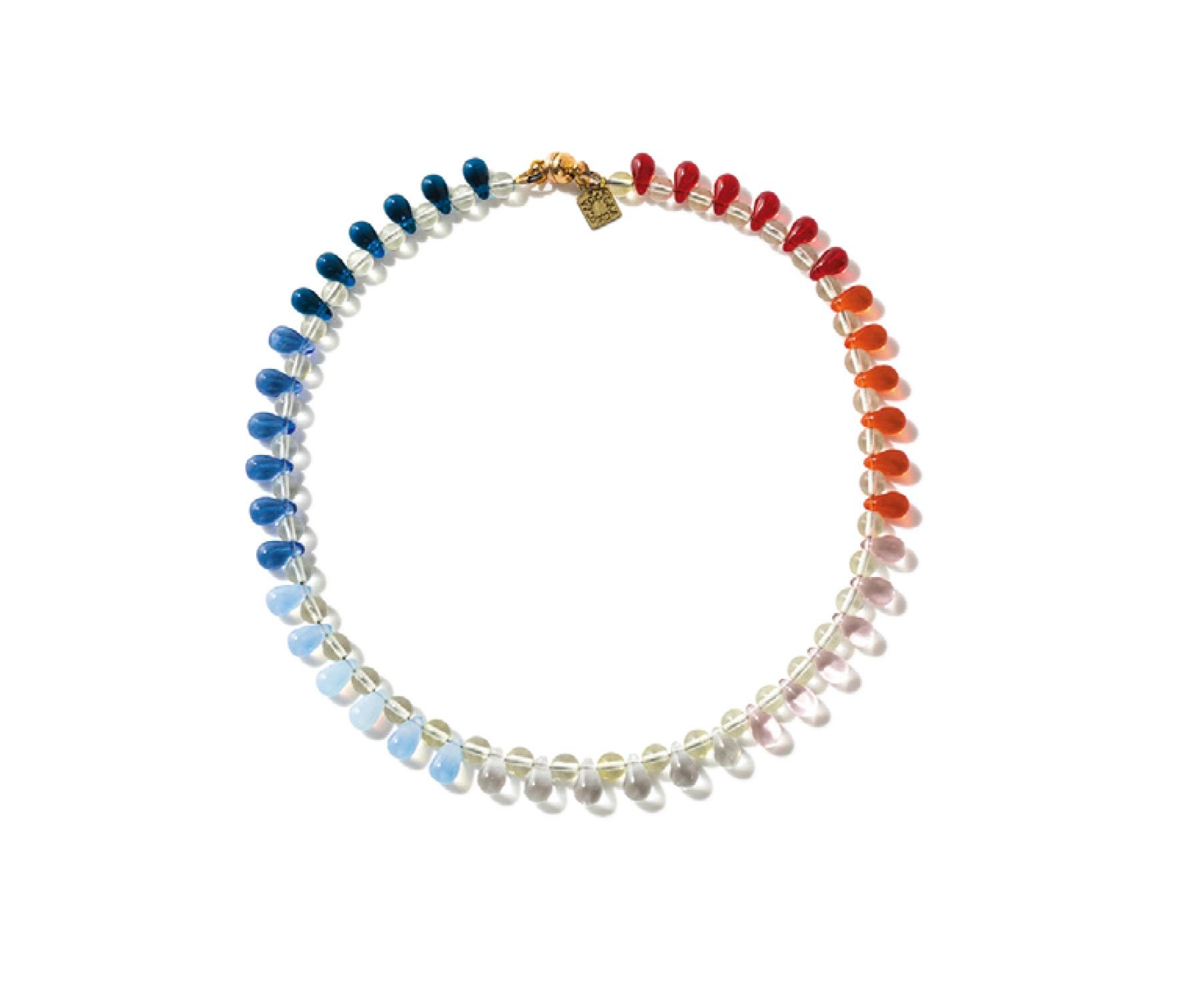 まるで虹のような、マルチカラーのガラスビーズネックレスにテンションアップ! アイテムはどれも、ジュネーブの工房で一つずつ手作りされている。¥50,600(アグラグラ/トゥモローランド TEL. 0120-983-511)