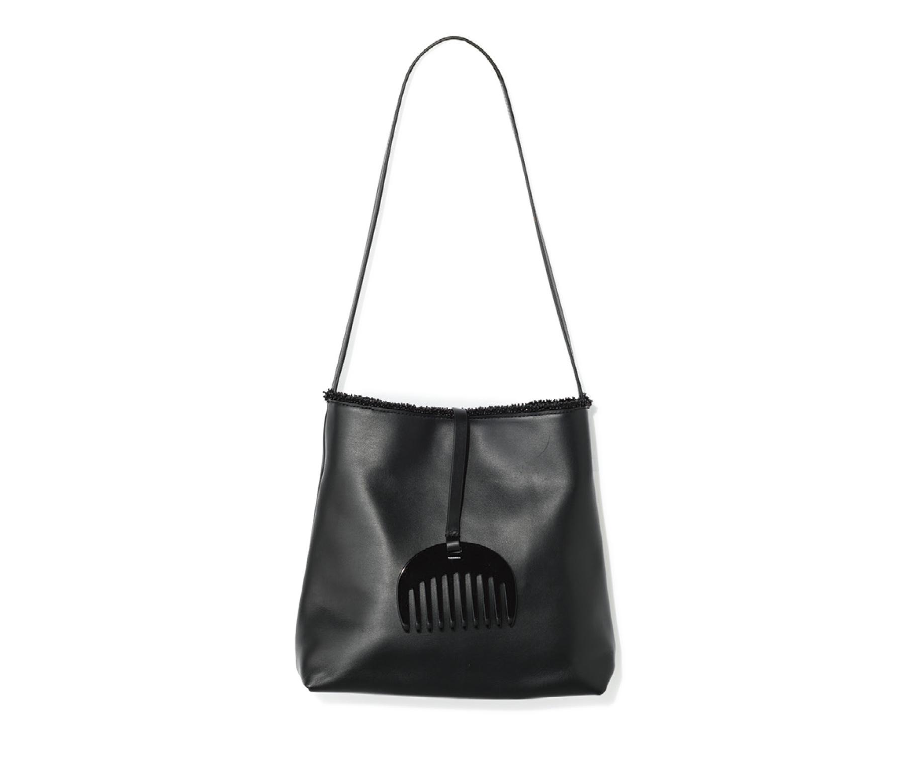 柔らかなカウレザーを使ったバッグは、口の部分にガラスビーズのパイピングをして、上品なきらめきをプラス。留め具はマグネット。W24×H24×マチ7cm ¥82,500(メルマ/フィルグショールーム)