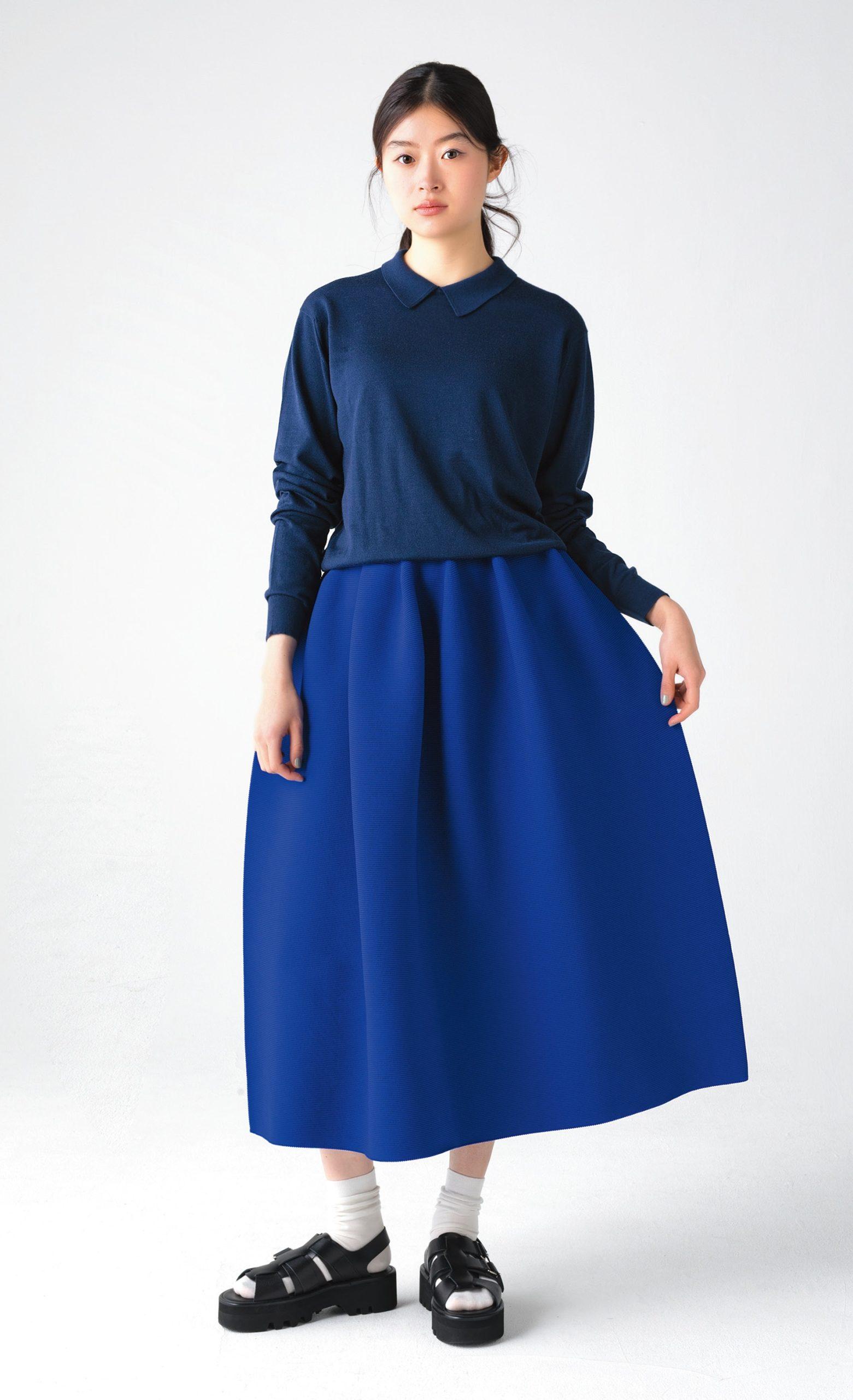 無縫製でまるまる服が編めるホールガーメントと呼ばれる3Dテクノロジーを採用したスカート。美しいシルエットとゴワつかない快適な着心地は、シームレスならでは。完全受注生産で50色以上の中から選べる。スカート ¥30,800(オートリコ/ドゥフォワイエ TEL. 086-206-5440) トップス ¥51,700(ジョン スメドレー/リーミルズ エージェンシー TEL. 03-5784-1238) 靴下 ¥3,300(パンセレラ/真下商事 TEL. 03-6412-7081) サンダル ¥68,200(ビューティフル シューズ×ハイク/ボウルズ TEL. 03-3719-1239)