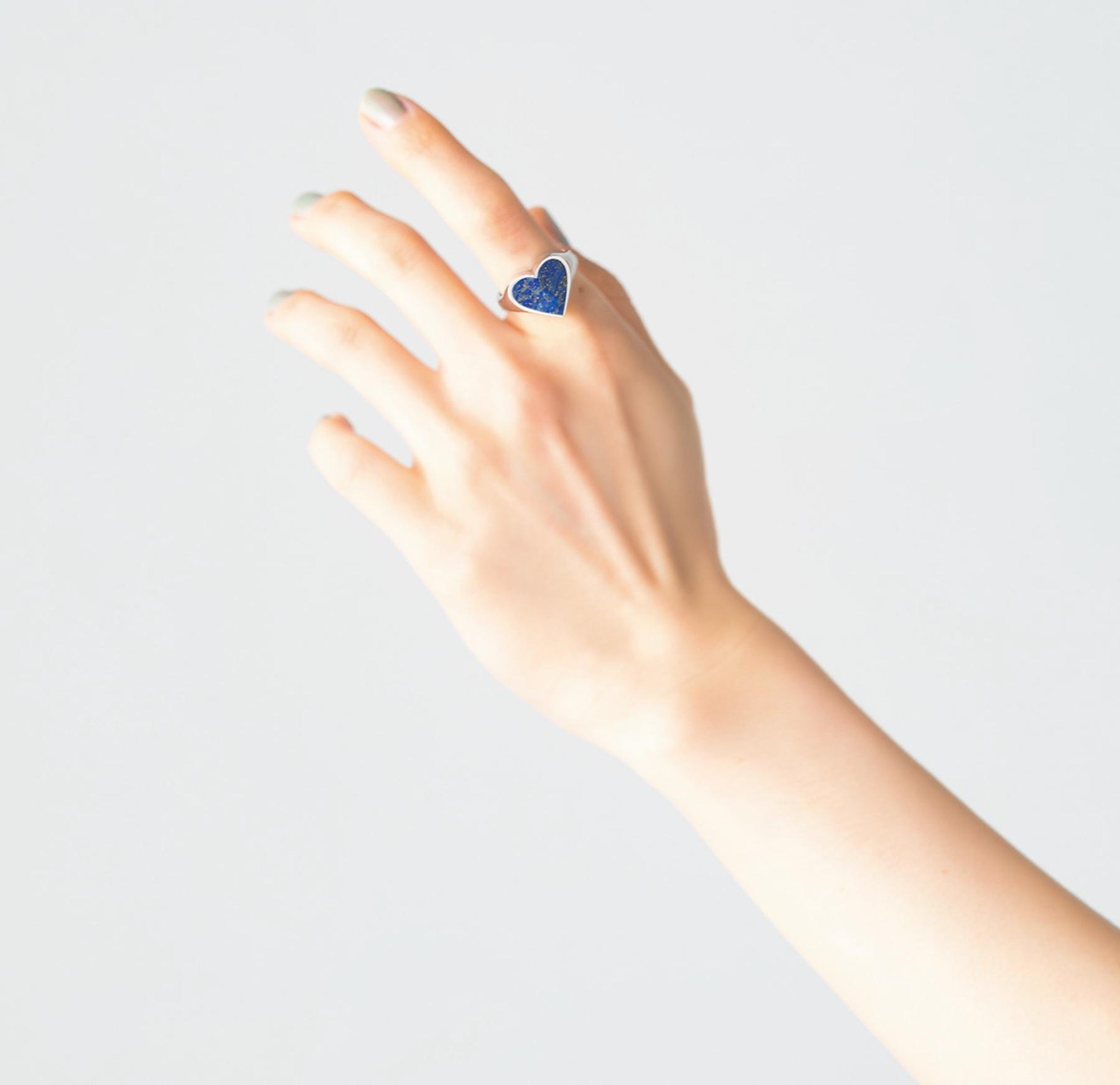決断力や叡智の象徴ともいわれるパワーストーン、ラピスラズリのリング。熟練の職人が一つ一つ丁寧にカットした、ソリッドなハートモチーフもオリジナリティ抜群。¥64,900(マユ/マユ ショールーム TEL. 0422-27-1778)