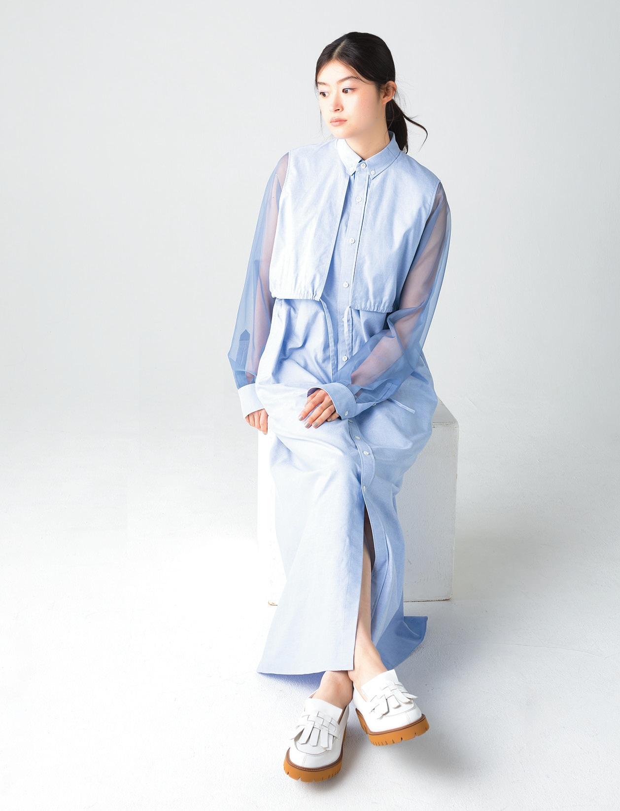 プレッピーな雰囲気のオックスフォードシャツワンピ。シアースリーブをドッキングすることで、季節感と甘さを投入。¥49,500(ハイク/ボウルズ) 靴 ¥39,600(ヨシト/ニューロンドン TEL. 03-5603-6933)