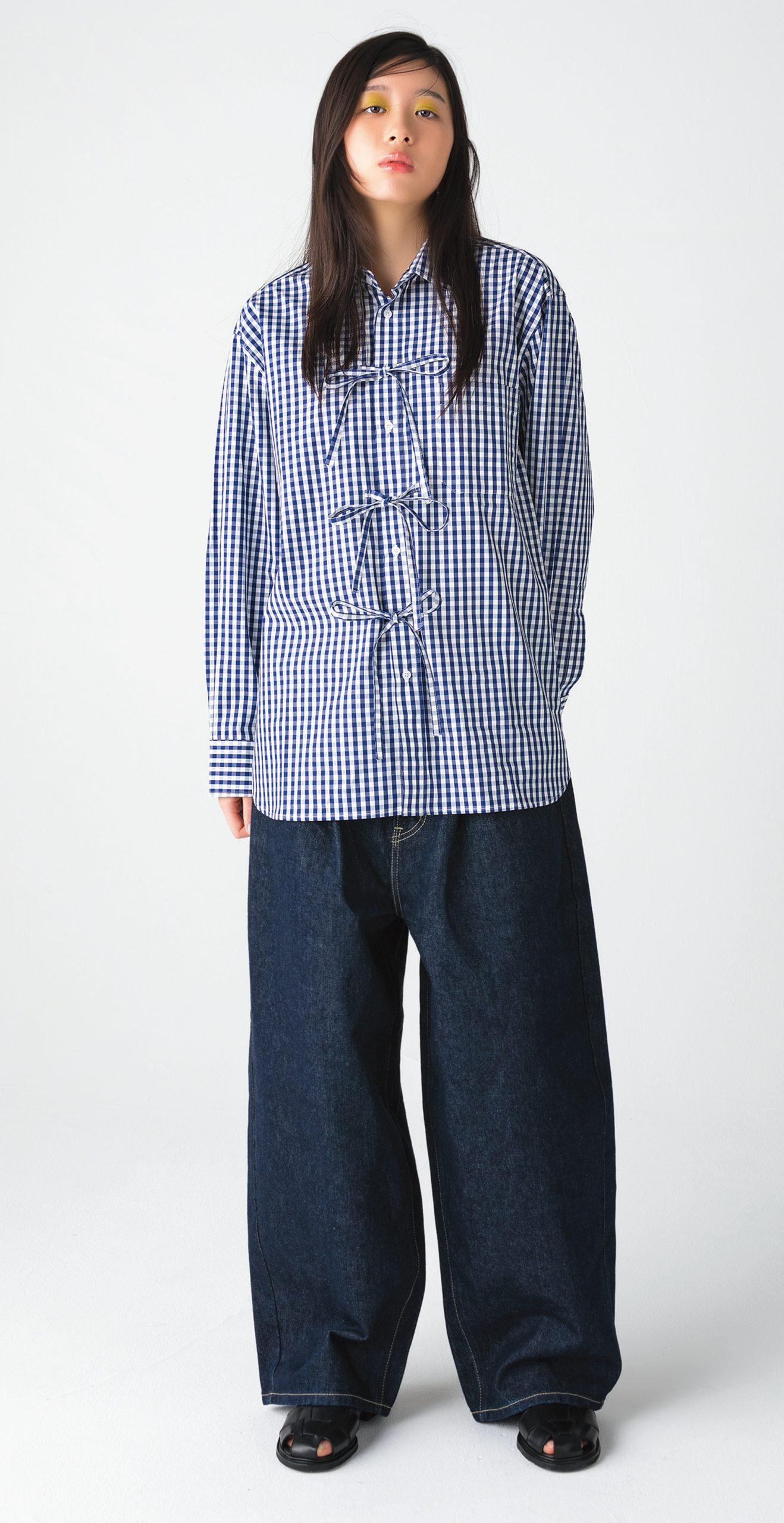 2021年にパリで誕生したウィメンズシャツレーベル『MA/RE』。フロントに3つのリボンがデザインされたチェック柄のシャツは、可愛らしさがありながらもどこかメンズライクな雰囲気が漂う一品。リボンをすべて結んで着用するのはもちろん、あえて結ばずラフに着こなすのもおすすめ。シャツ ¥31,900(MA/RE/ジャーナル スタンダード 自由が丘店 TEL. 03-5731-0128) パンツ ¥22,000(LEE/ジャーナル スタンダード レリューム ルミネ新宿店 TEL. 03-5909-4675) シューズ ¥74,800(パラブーツ/ RHC ロンハーマン)