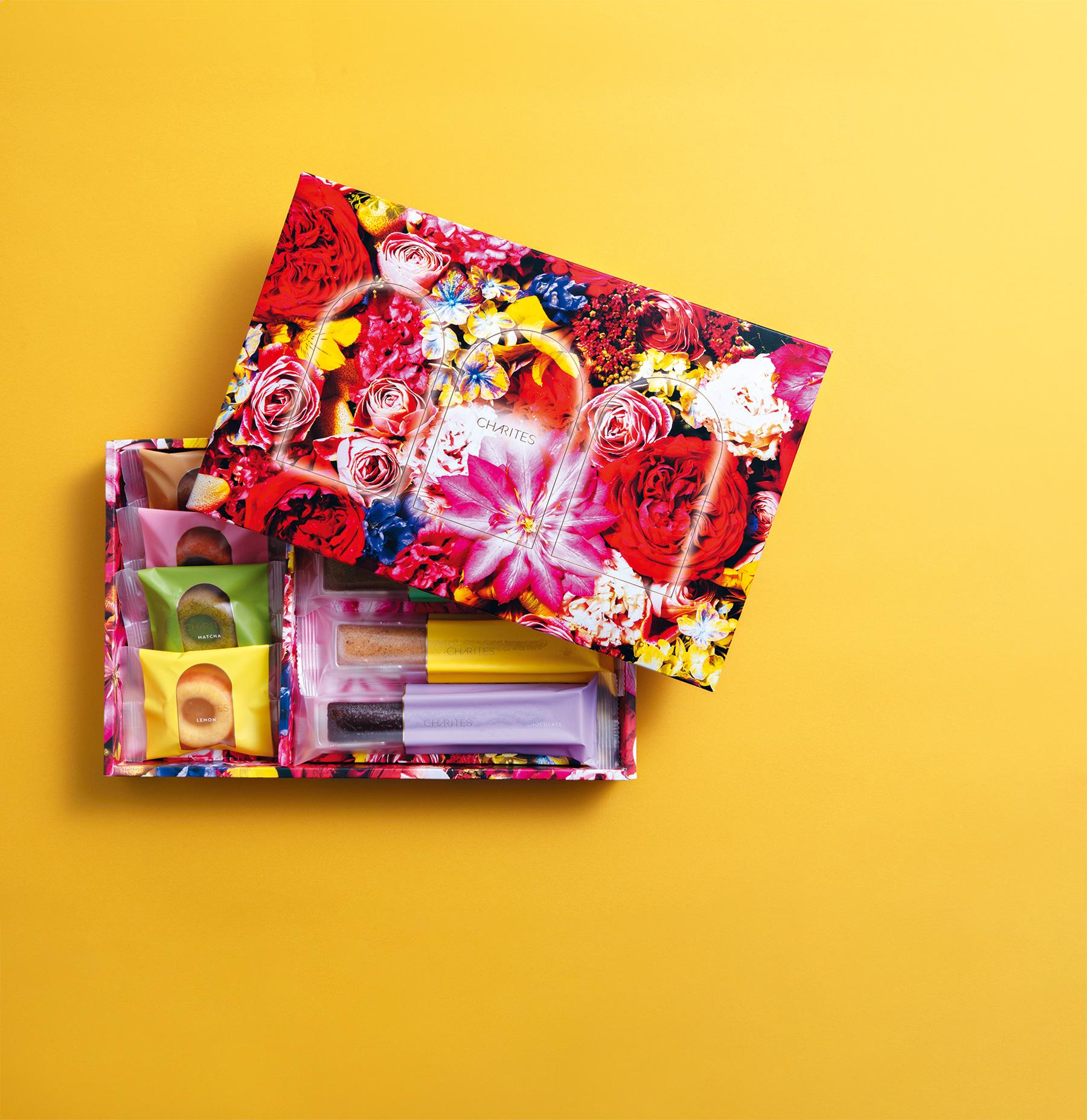 エンゼル型フィナンシェとスティックケーキのセット 「 ladyofthegarden(レディオブザガーデン)」/一瞬で目を奪われる花のボックスは、エンゼル型フィナンシェ 「フルールドロン」とスティックケーキの詰め合わせ。カラフルなジュレを中央に流し込んだフルールドロンは、レモン、マッチャ、ロゼ(イチゴ)、コーヒー の 4 種類。スティックケーキは、プレーン、ピスタチオ、レモンティー、チョコの 4 種類の フレーバーが楽しめる。各1個入り。実際の花の写真を加工して作られたボックスは、渡した時に驚きがあってインパクト大(8個入りアソート¥3,024)。
