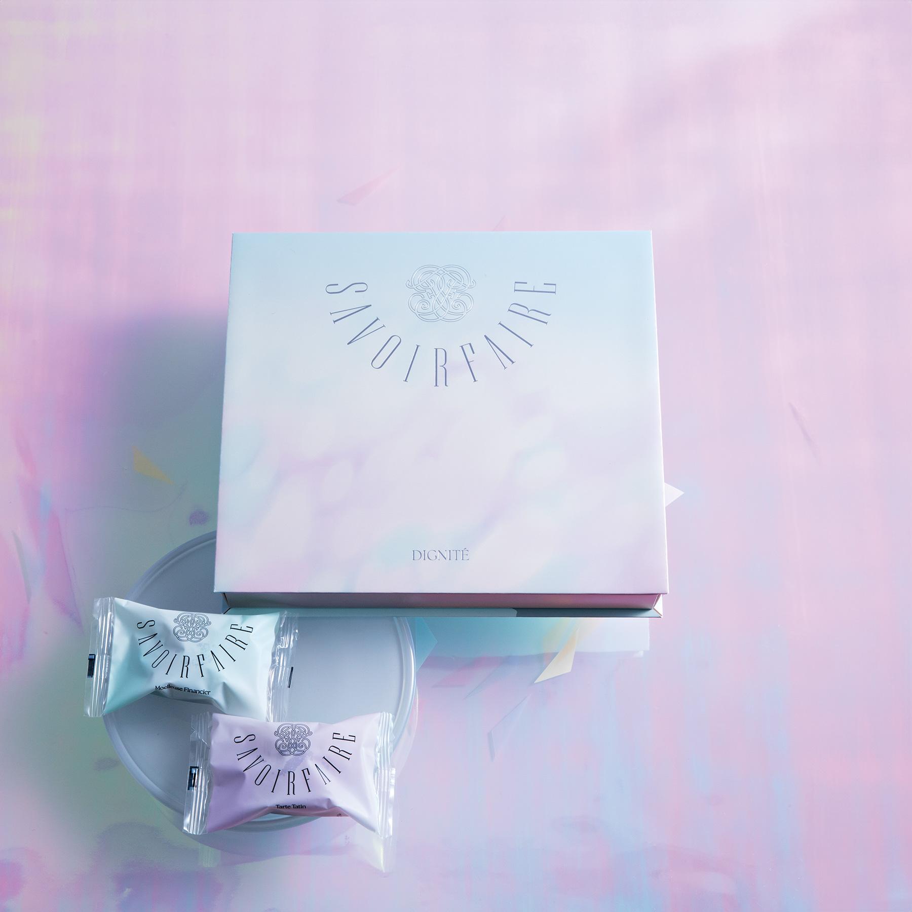 フィナンシェとタルトタタンの詰め合わせ「ディニテ dignitè」/オーロラのように幻想的な美しさを放つ特殊加工の紙を使ったボックスの中に入っているのは、 モワルーズフィナンシェ(ふんわりフィナンシェ/アールグレイ)とタルトタタン。各4個入り。モワルーズフィナンシェはアールグレイ風味のジュレを忍ばせ、上品な紅茶の香りに包まれる。タルトタタンはりんごの甘みとキャラメルの香りが絶妙にマッチ。どちらもしっとりとした生地からジュレが溢れ出す優雅な味わいで、一口でおいしさの虜に(8個入りアソート ¥4,104)。