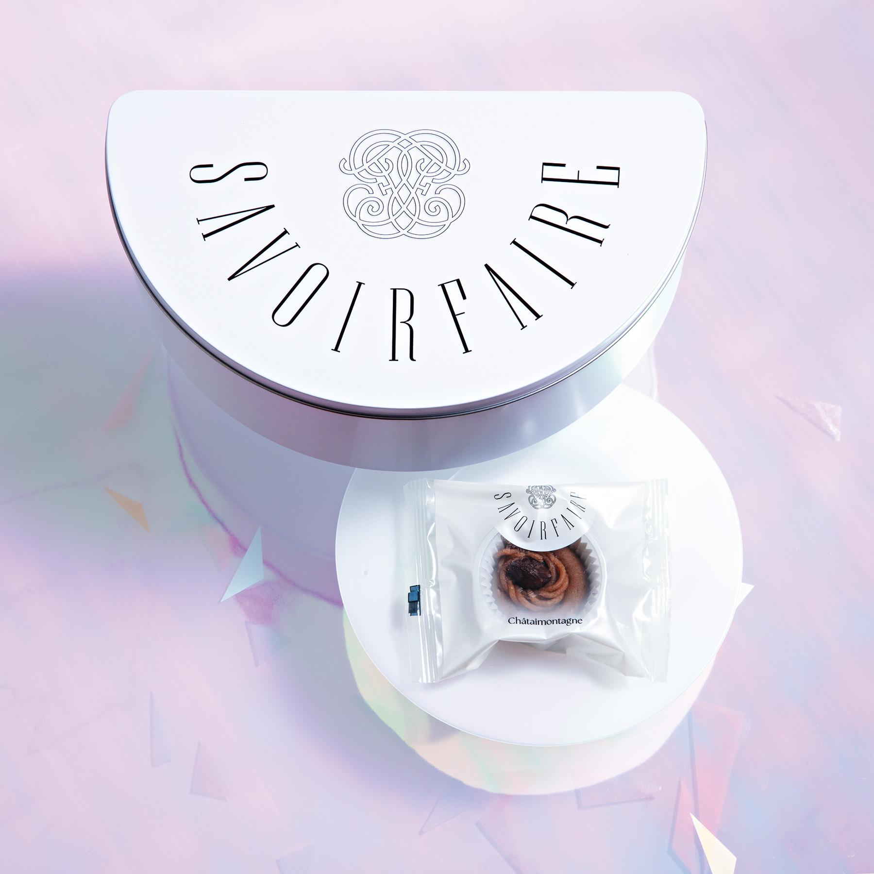 焼きモンブランを詰めた、 半月型のパッケージ「エクレール 6 èclair6」/コク深くなめらかなマロンクリームを絞り、その上にマロンをあしらった一口サイズの「シャティーモンターニュ(焼きモンブラン)」。身につけることで気分が高揚するハイブランドのアイテムのようなお菓子を目指し、 パッケージは光を表現。お菓子のパッケージとしてはあまり見かけない半月缶を採用し、商品名の由来でもある稲妻の閃光部分が凄まじくスパークしている様の白光をデザインに反映。まるで高貴な光に包まれているかのように上品に輝く(6個入り¥3,024)。