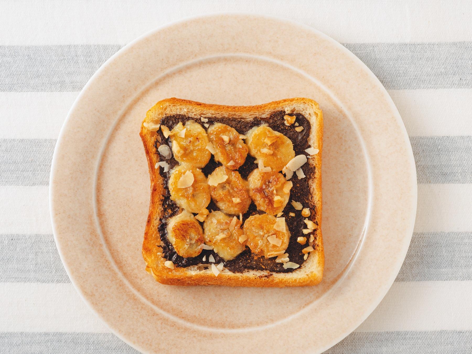 「全粒粉パン、バナナ、100%ココアパウダーとメインの材料全てに食物繊維が含まれる、食物繊維ファーストなトーストです。甘さ控えめなので、好みに応じてはちみつを足してみても」