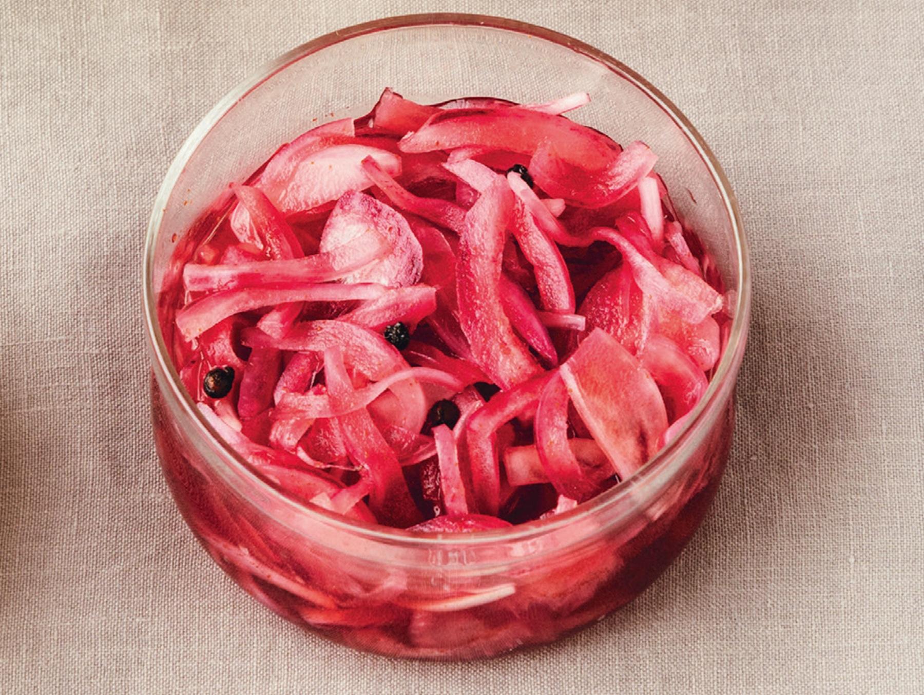 紫玉ねぎ…1個(約200g)、塩…小さじ1/2、A[酢、水…各1/2カップ、砂糖…小さじ1、塩、黒粒こしょう…各小さじ1/2、赤唐辛子(粉)…小さじ1/2]