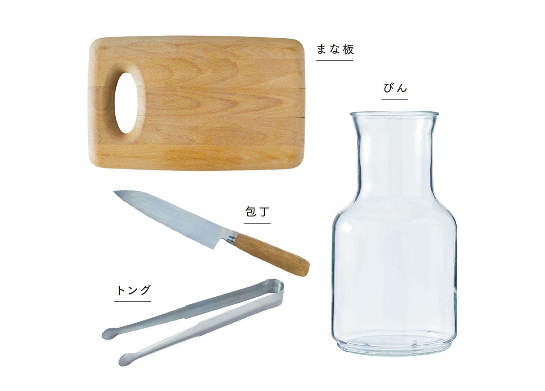 水を入れる容器、包丁、まな板を用意。冷蔵庫保管のため、ふた付きの容器かラップでふたをするとベター。食材はトングや菜箸、スプーンで入れて。水はミネラルウォーターが理想。水道水なら5分ほど沸騰させカルキ臭を除き、冷やしてから使用を。2時間ほど漬け込めば飲みどきに。生の食材なので、1~2日で飲み切ること。その間なら水の継ぎ足しもOK。