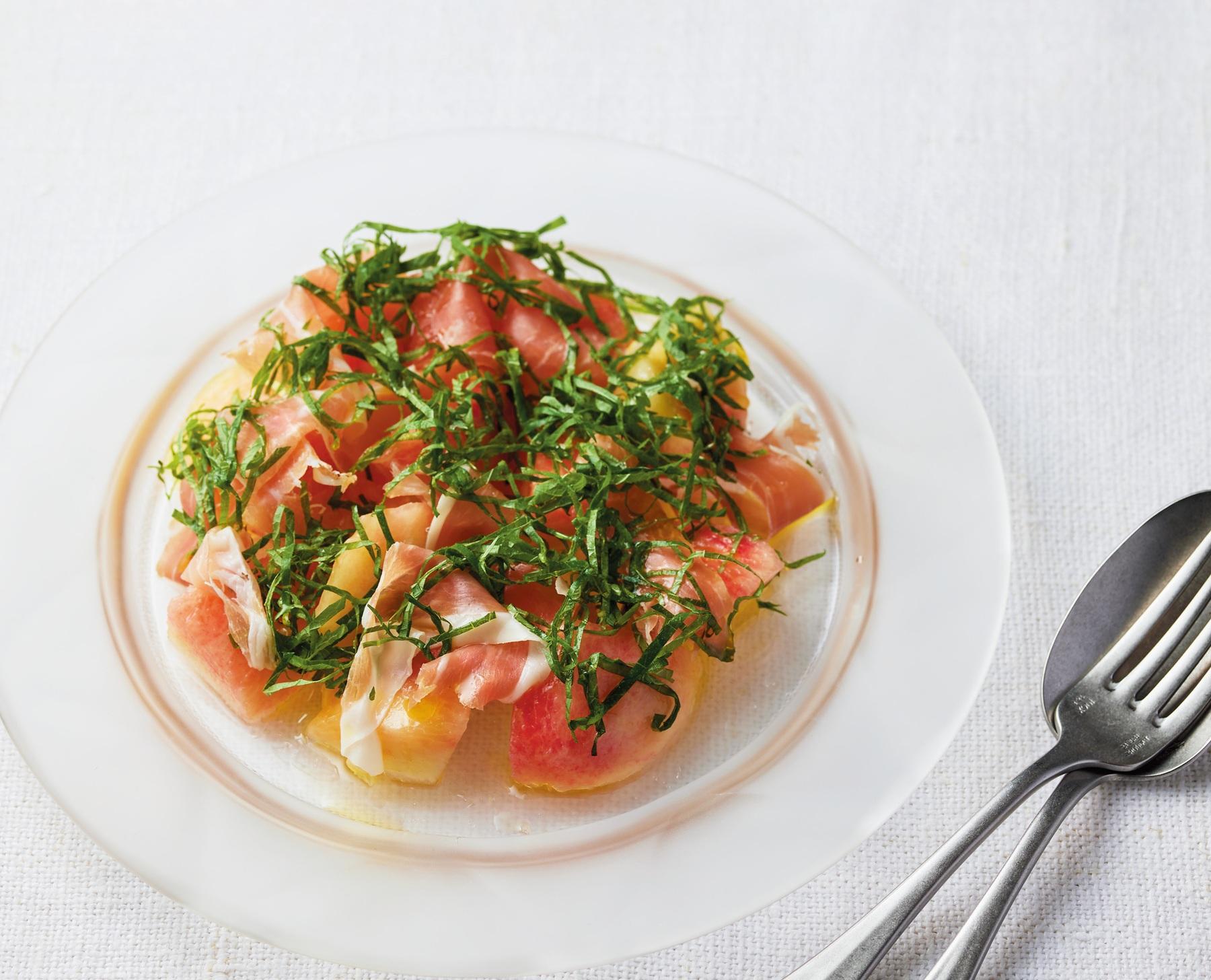 【桃と生ハム、大葉のサラダ】みずみずしい甘じょっぱさに大葉の香りをふわり