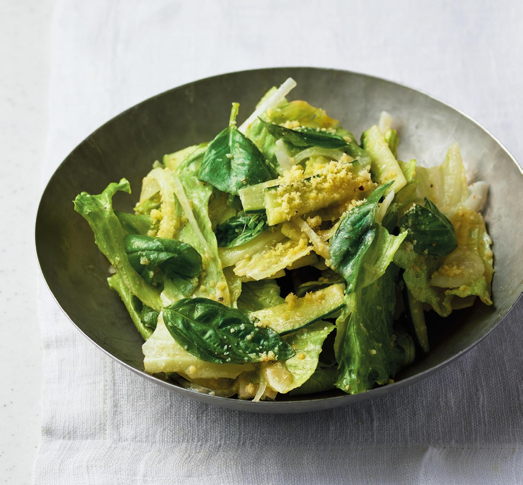 バジルが香るシャキシャキのグリーンサラダは、粉チーズと味噌入りのドレッシングで味付け。複雑で深みのある味わいが魅力。