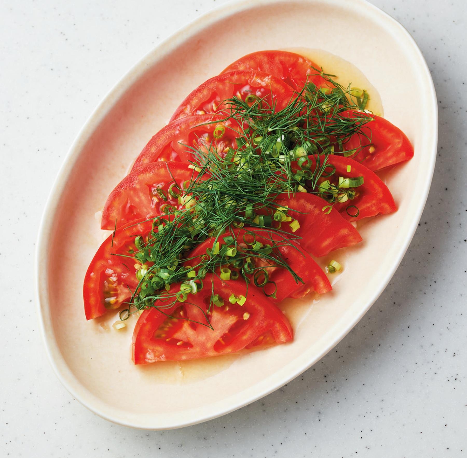 体を冷やし肌にもいいトマトにトッピングしたのは、和の定番薬味の青ネギ。ディルやナンプラーと合わせてエスニックな風味に。