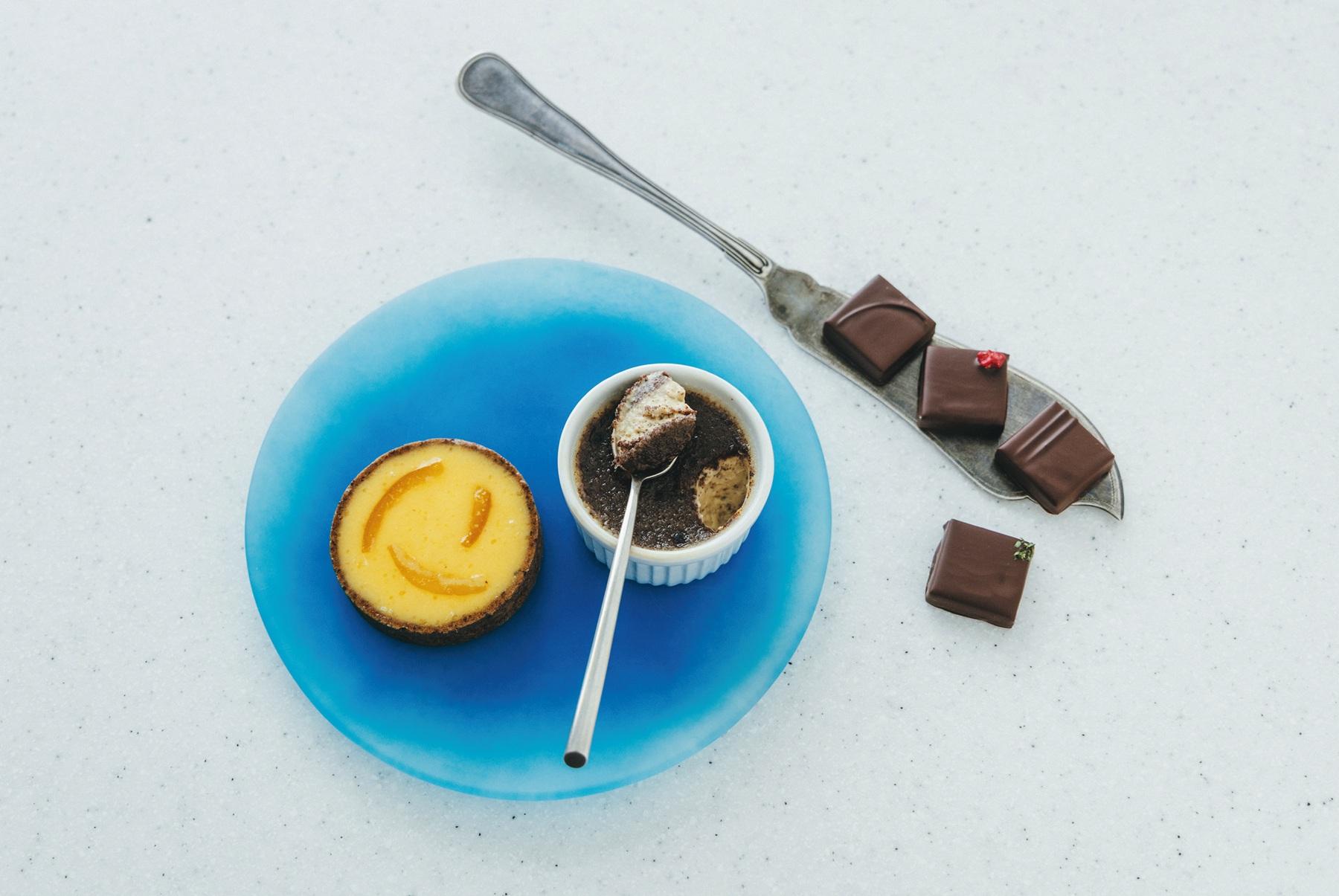 一見チョコっぽくないタルトやブリュレにはカカオハスク(カカオ豆の薄皮)が大活躍。ハスクまで産地別で使い分けるなんて初めて聞いた。レモンタルトなら柑橘香がありスパイシーなインド産ハスクを生地に忍ばせて。生レモンから搾った果汁と皮のピュレを混ぜたクリームの爽香の後から、ハスクの香りがじわじわ奥行きを広げていく。やっていることはマニアック、でも詳しくなくても素直においしいし、知るほどにどこまでも味わい深くなる!