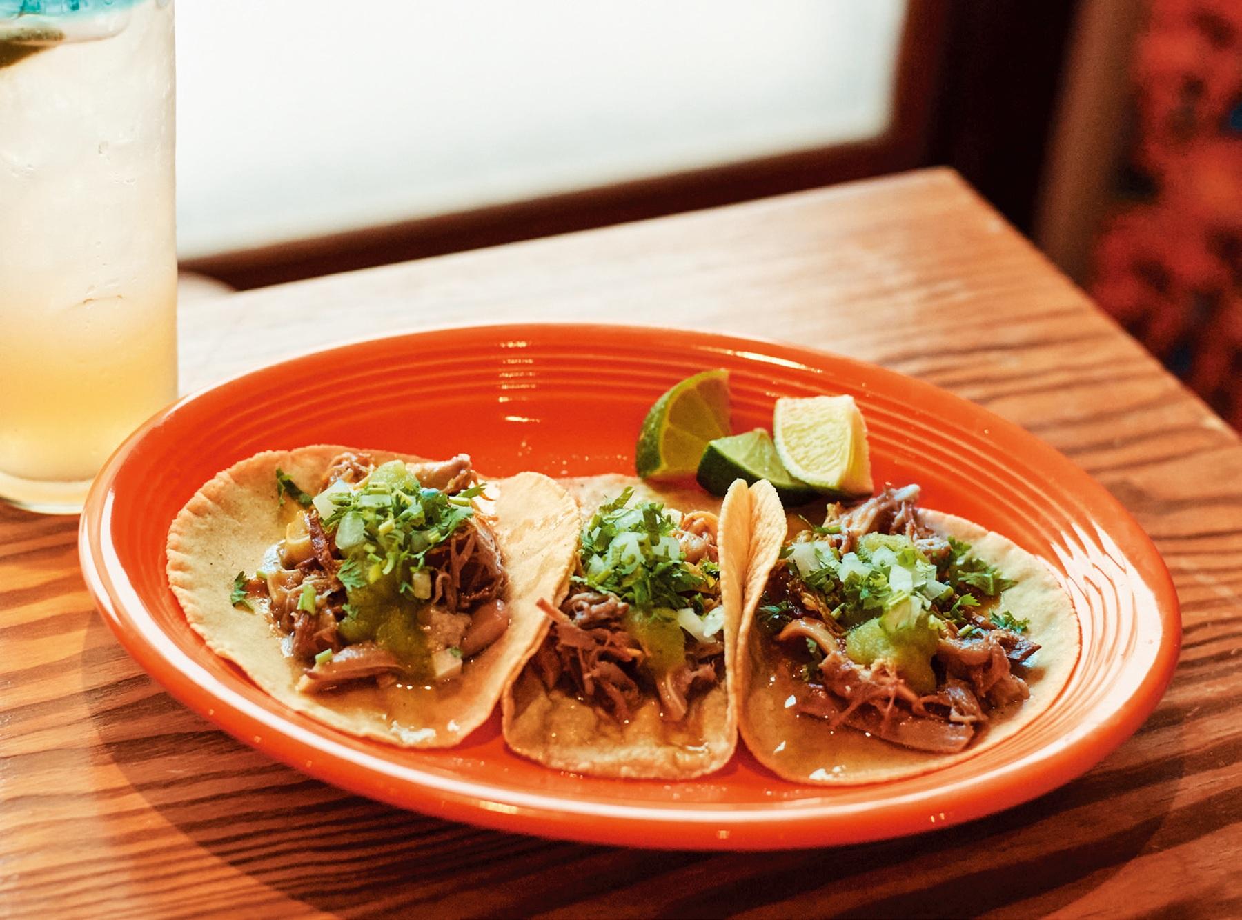 シェフ・小澤懸人さんが注文を受けてから一枚一枚丁寧に焼く自家製のトルティーヤが自慢。タコスは6種類で一番人気は〈カルニータス〉3ピース¥1,375。「肩ロースや軟骨など豚肉のさまざまな部位を煮込んだ、食感から楽しめる一品。古民家を改装した落ち着いた雰囲気の店内で味わえます」