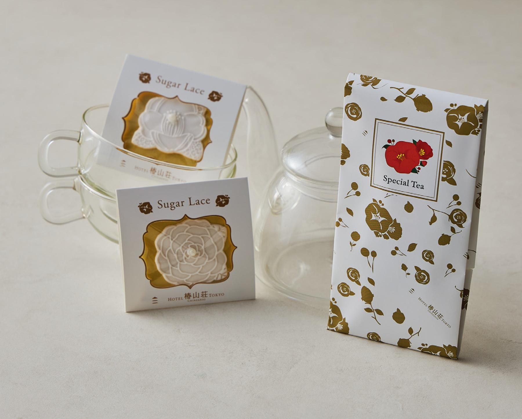シュガーレースとは、レースのように繊細にデザインされた砂糖のこと。こちらはホテル内の庭園に咲く美しい藪椿、東京椿、乙女椿を描いたシュガーアートと、ダージリンのティーバッグのセット。「紅茶を淹れてその上にシュガーアートをのせると、ティーカップにお花が咲いたようで美しく、溶けていくさまをじっと見るのも楽しい。そういうリラックスした時間を持ってね、という思いを込めて、日々忙しくしている友人に贈りたいです」。シュガーレース×3袋、ダージリンティーバッグ×3個入り。