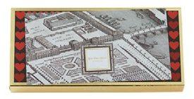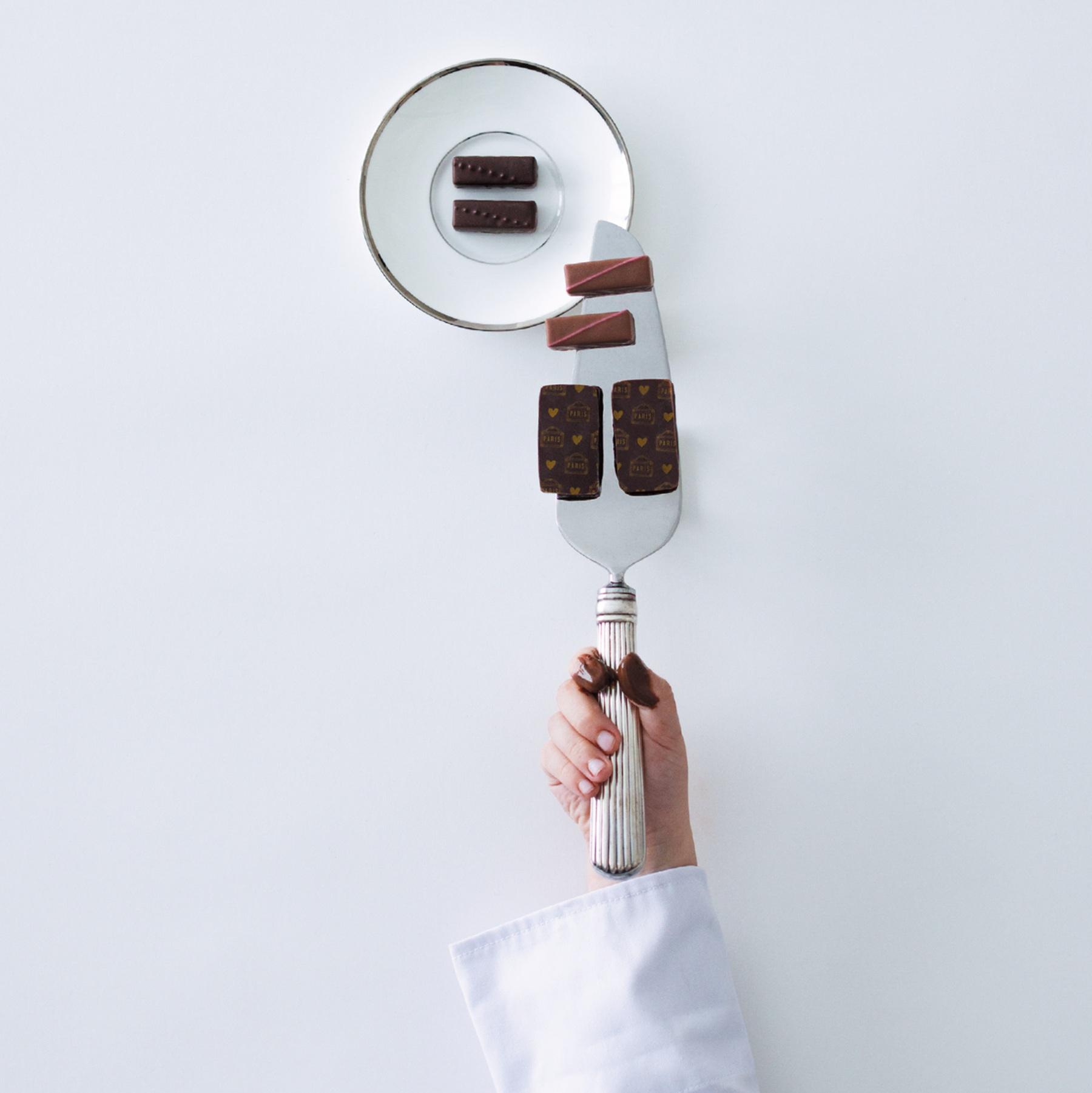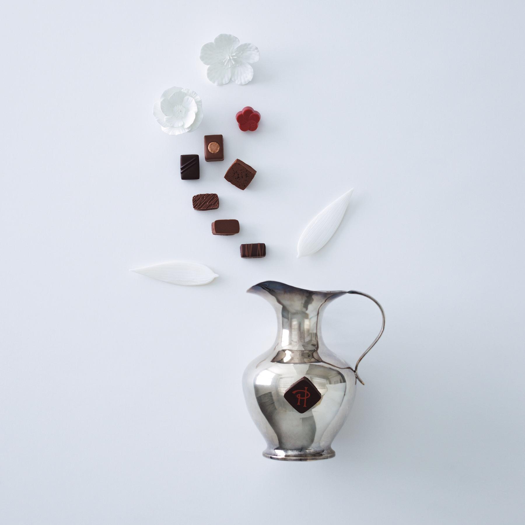 芸術と美食、ファッション、そして光とロマンスの街・パリ。現実と夢幻が交差する「パリの生活」を描いたボックスを開くと、ジュエリーのようなショコラが輝く。ピエール・エルメさんの代名詞・マカロンを招き入れたショコラの新作は、珍しいシベリア杉の実のプラリネ。小さなマカロンがちょこんとのる一粒を齧ると、松の実に似た柔らかな香ばしさとコクの後から、わずかに森林の清々しさが立ち上る。