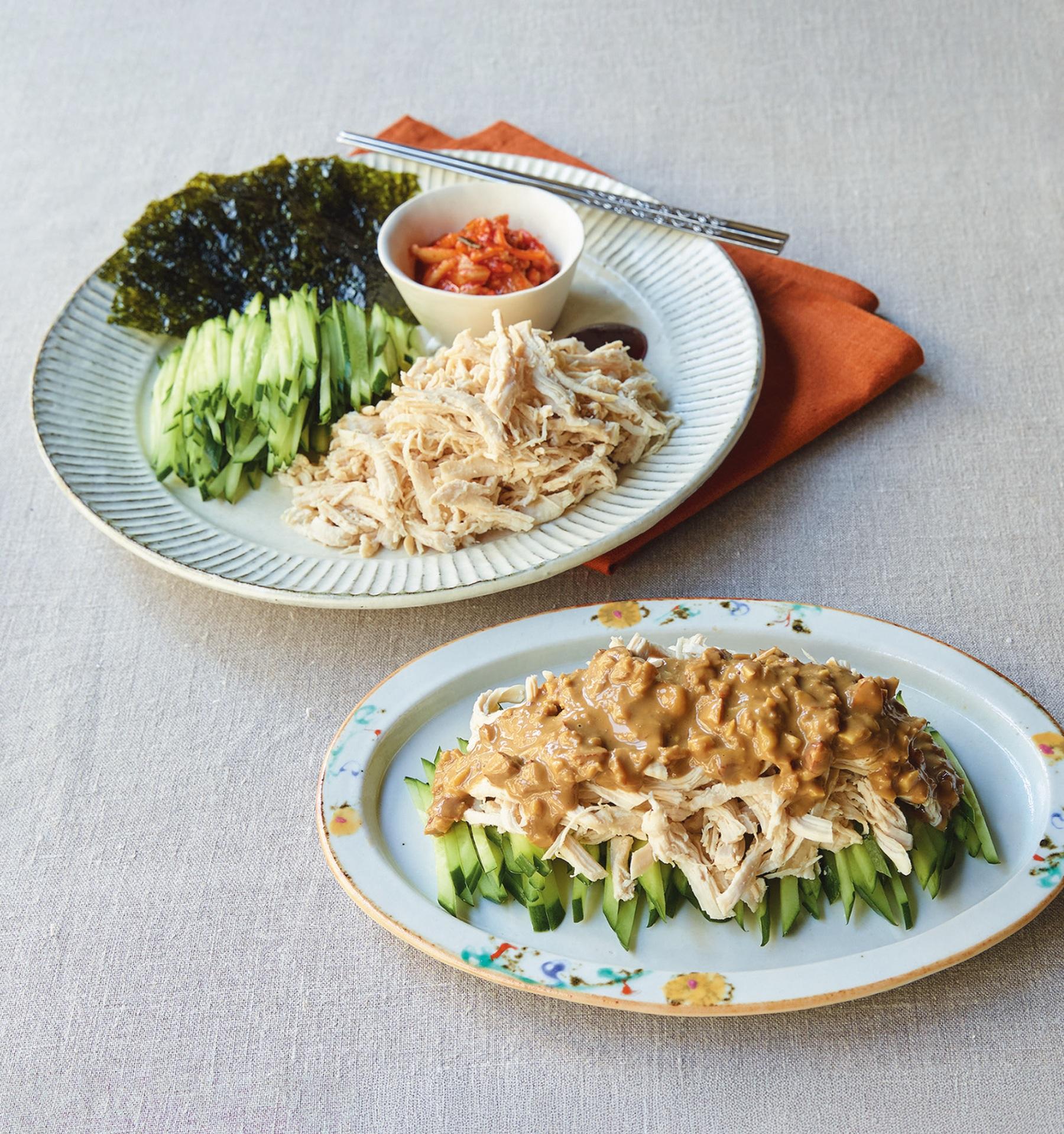 上・茹で鶏 韓国のり巻き、下・茹で鶏 バンバンジー風