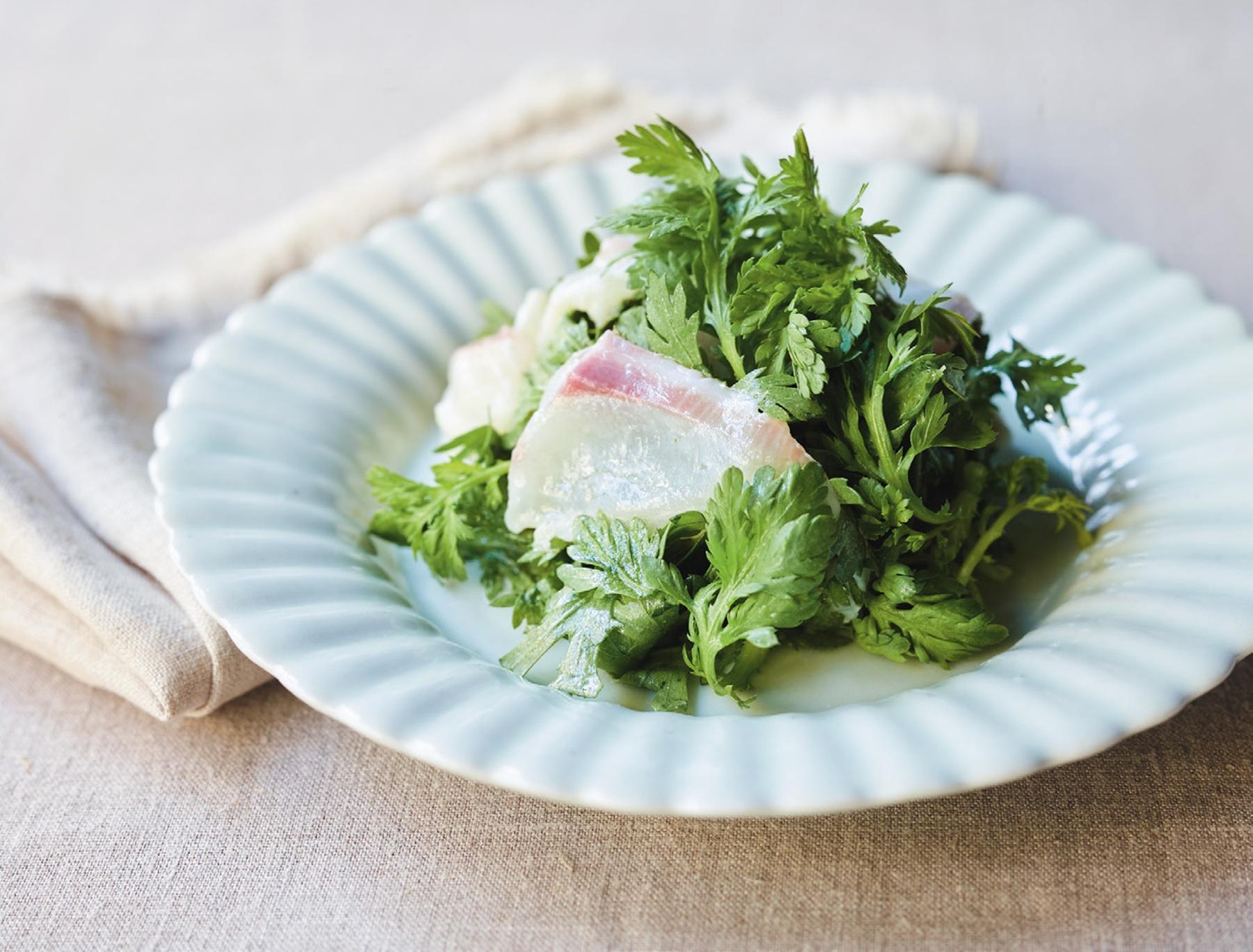① ボウルに薄切りにした鯛の刺し身と春菊の葉を入れる。