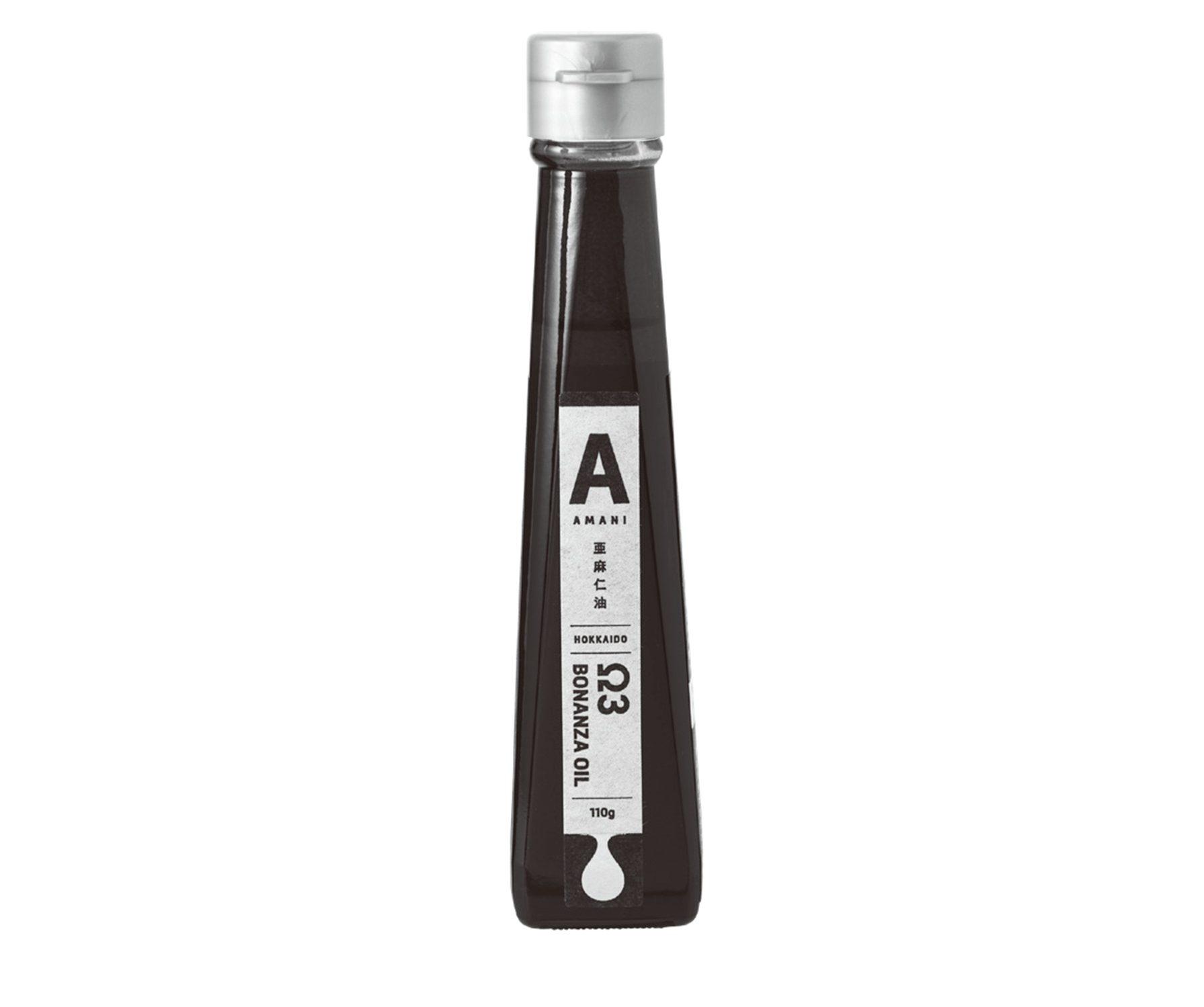 北海道の生産者が種から栽培。低温圧搾法で製造した「BONANZA OIL 北海道産アマニ油110g」¥1,980。優しい苦みで、アマニ油初心者向け。