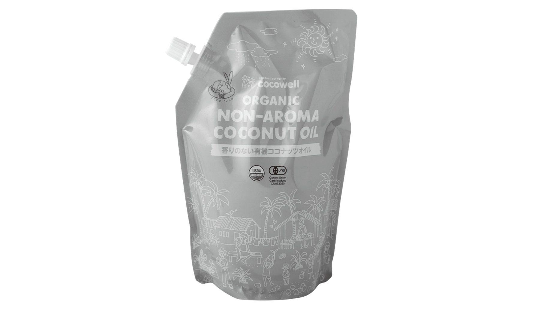 ココナッツの果肉を乾燥させたコプラを原料にした「ココウェル 香りのない有機ココナッツオイル460g」¥1,188。通常より甘い香りがなく、固まっても袋ごと湯せんできるので使いやすくて便利。
