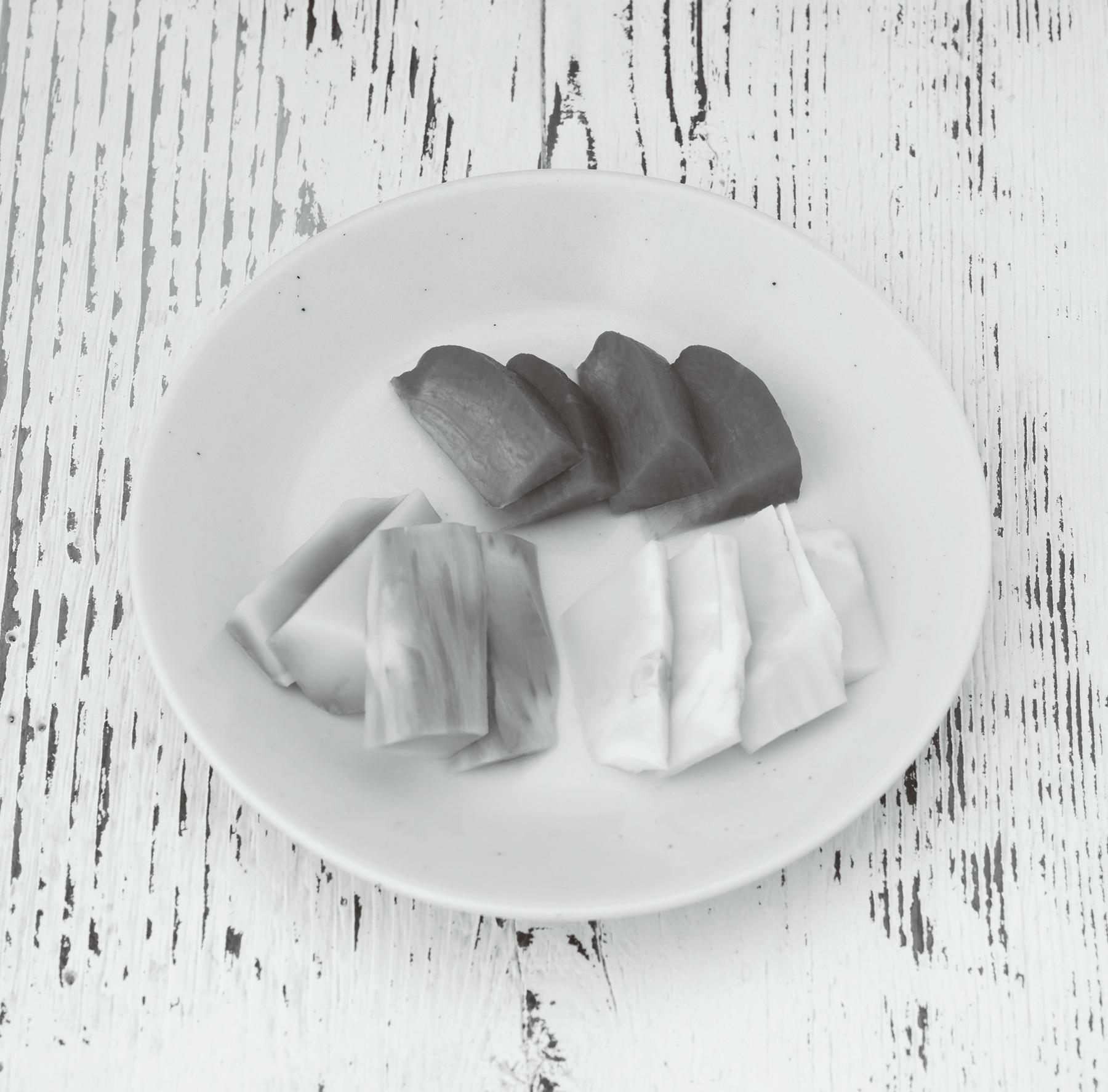 ① ブロッコリーの茎は乱切りにし、キャベツの芯は薄切りにする。ニンジンは、葉がついていた溝の部分を洗い、食べやすい大きさに切る。全ての食材を耐熱容器に並べ、電子レンジ(600W)で1分ほど加熱する。
