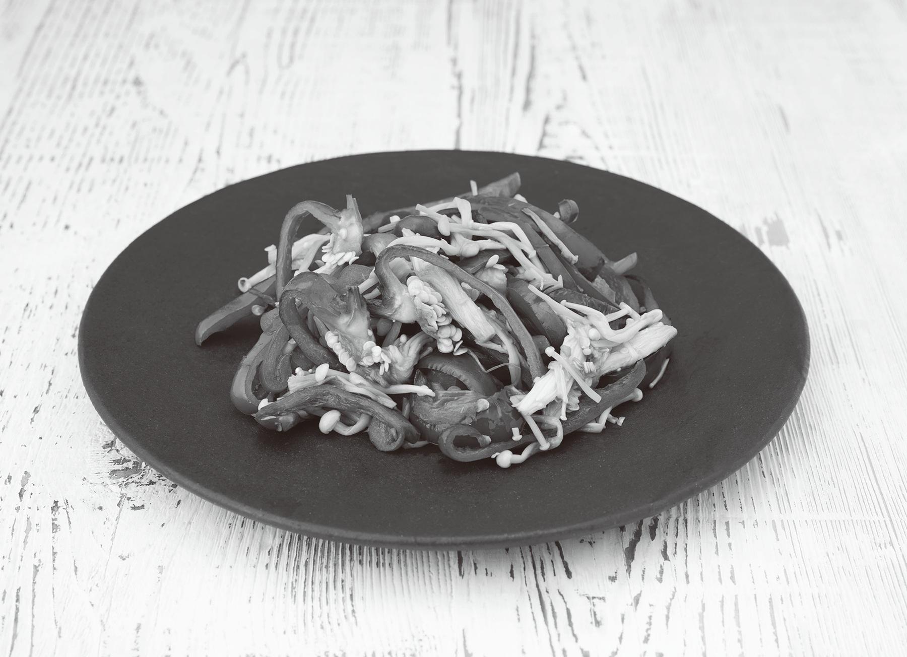 ① ピーマンは、半分にカットし、わたや種は取り除かずそのまま千切りにする(ヘタが変色しているなど気になる場合は取り除く)。えのきは、汚れがついている石づきの部分だけを切り落とし、食べやすい程度にほぐして半分に切る。